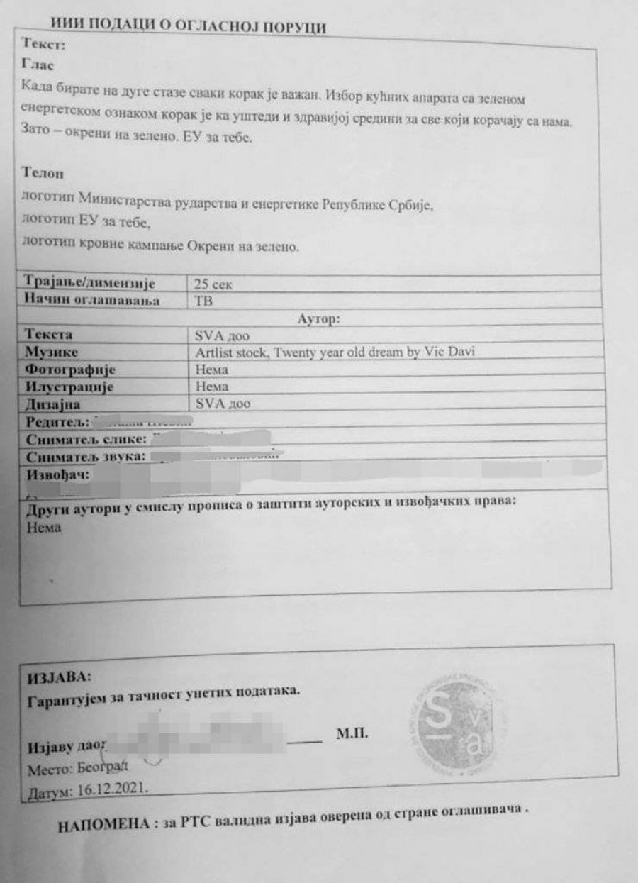Ovo se navodi u spotu koji se medijima distribuira preko "Dajrekt medije", uz logotipe Ministarstva rudarstva i energetike, projekta "EU za tebe" i krovne kampanje "Okreni na zeleno". Spot traje 25 sekundi.