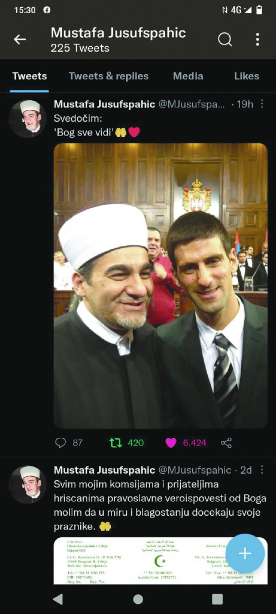 I beogradski muftija Mustafa Jusufspahić je dao nedvosmislenu podršku Đokoviću, koji danima trpi torturu australijskih vlasti. On je na nalogu na Tviteru objavio sliku s najboljim svetskim teniserom, uz reči: