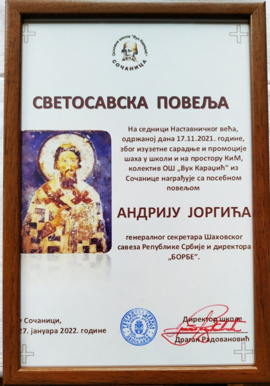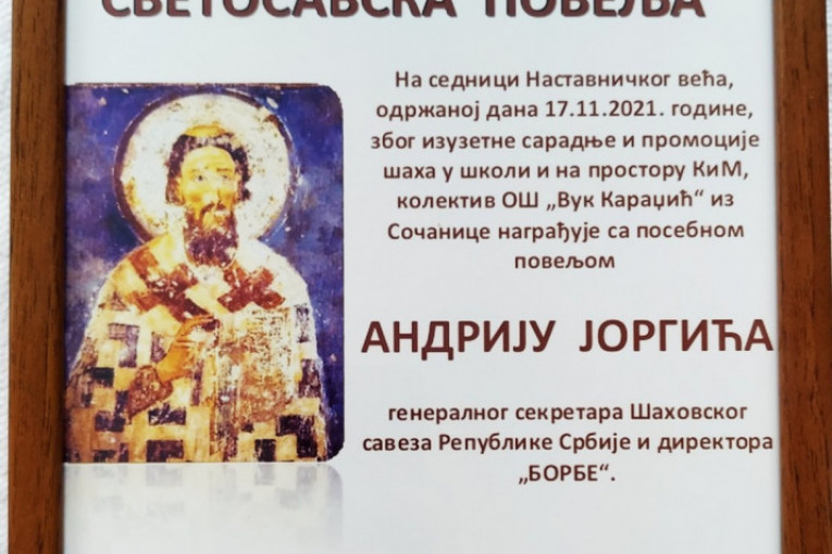 - Od svih priznanja koje sam do sada dobio, moram da kažem da mi je ovo najdraže. U narednom periodu ćemo zajednički raditi na promociji kulture i tradicije,kao i šaha, koji je izuzetno važan za razvoj dece - istakao je Jorgić, koji je ovom prilikom odigrao simultanku na deset tabli sa đacima škole.