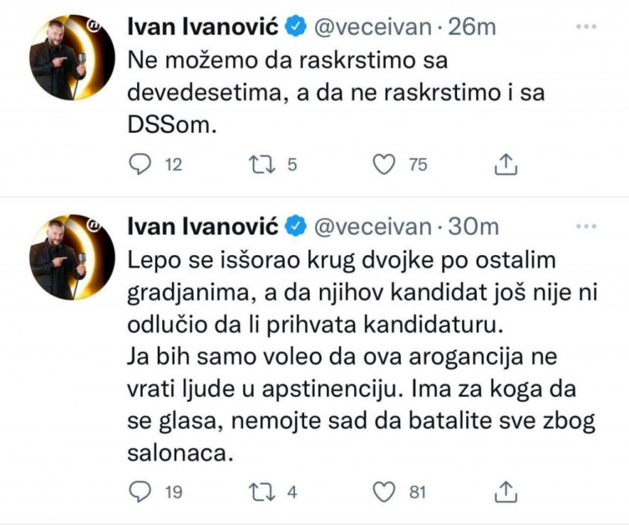 "Lepo se isšorao krug dvojke po ostalim građanima, a da njihov kandidat još nije ni odlučio da li prihvata kandidaturu", naveo je na Tviteru voditelj Ivan Ivanović.