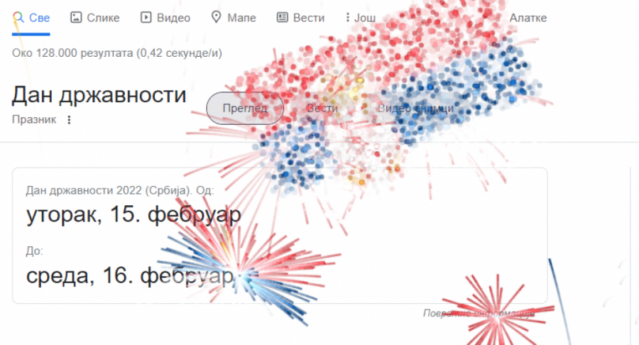 Klik na zastavu odvešće vas na stranicu na kojoj piše da je danas Dan državnosti, a dočekaće vas spektakl - vatromet koji pravi zastavu Srbije.