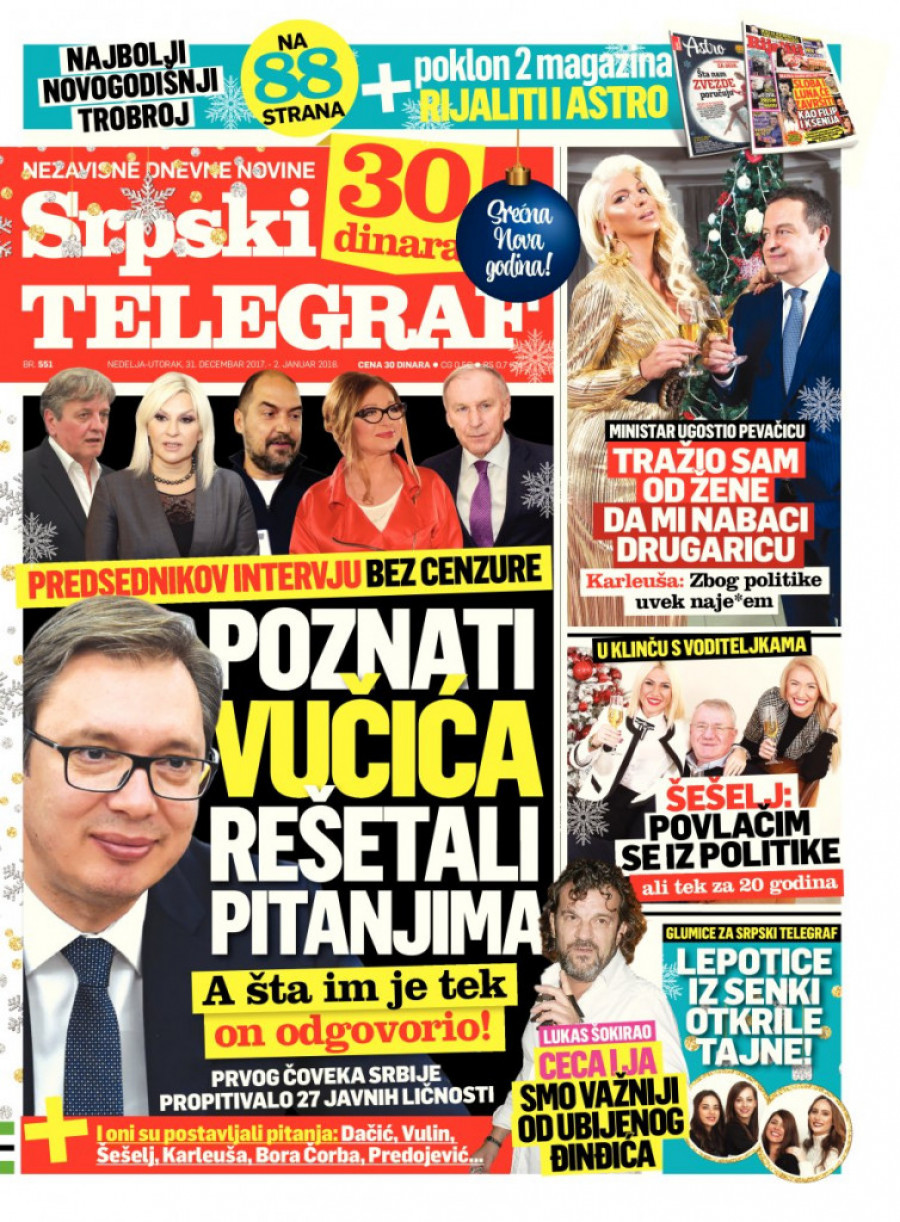 U najboljem novogodišnjem trobroju na 88 strana Srpskog telegrafa, pročitajte eksluzivni intervju sa Aleksandrom Vučićem, predsednikom Srbije, u kome ga je 27 poznatih ličnosti rešetalo pitanjima.