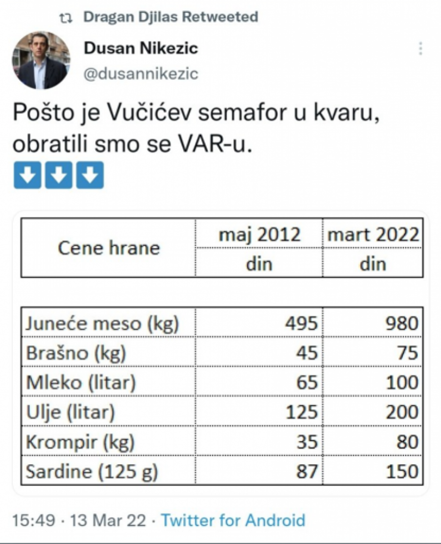 Nikezić je, naime, izneo navodne podatke koji bi trebalo da ilustruju da su cene hrane gotovo duplirane u odnosu na 2012, kada je bivši režim, čiji je i on deo bio, izgubio vlast. Cene prehrambenih proizvoda jesu, doduše, porasle svugde po svetu u odnosu na pre deset godina - prvo zbog korone, a sada i zbog rata u Ukrajini. Međutim, daleko da su onolike kolike je Đilasov stručnjak na Tviteru naveo da jesu. A što je lako proverljivo u svakom (onlajn) marketu.