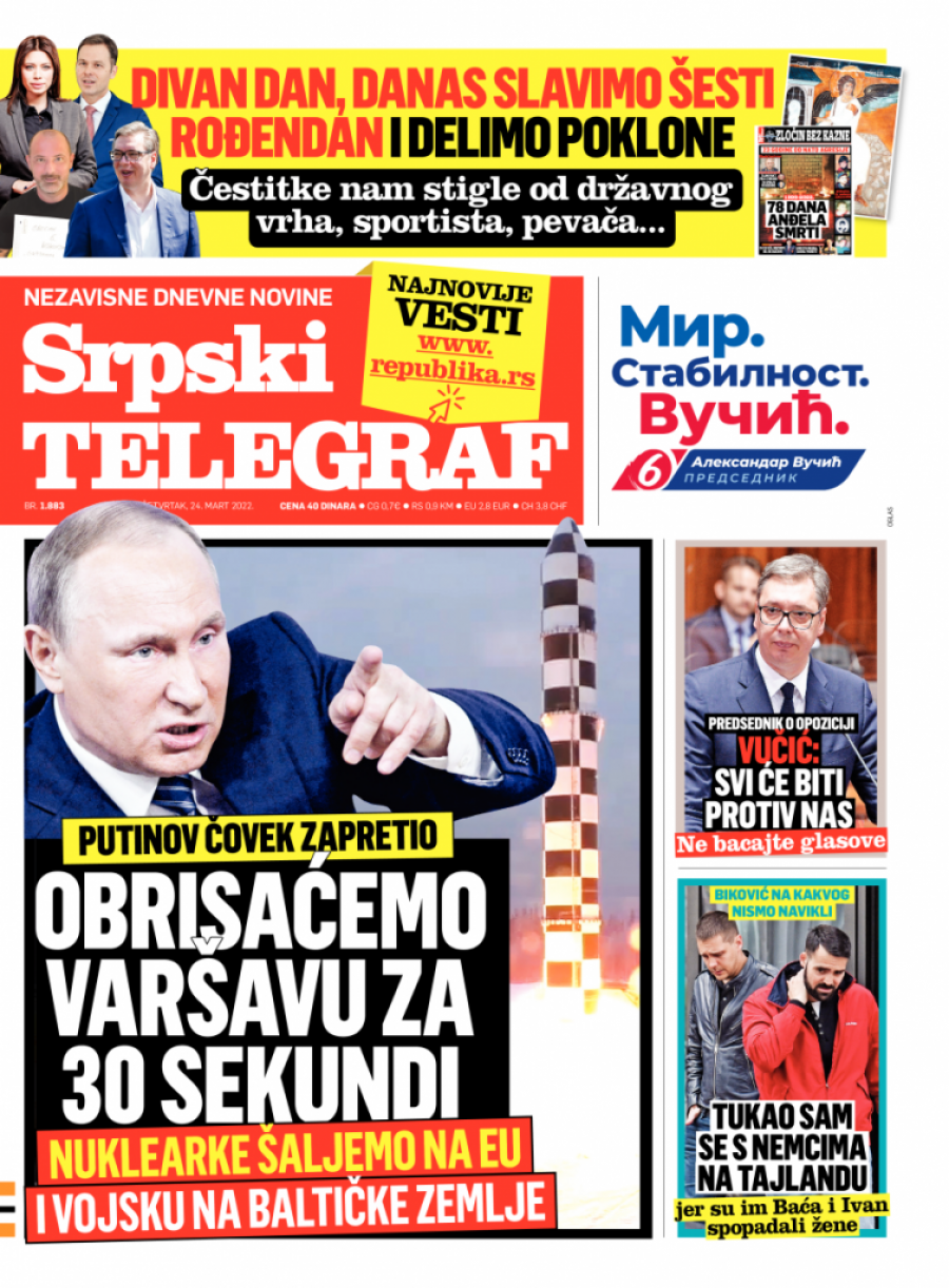 Srpski telegraf u štampanom izdanju za četvrtak 24. marta donosi pregršt važnih i zanimljivih priča.