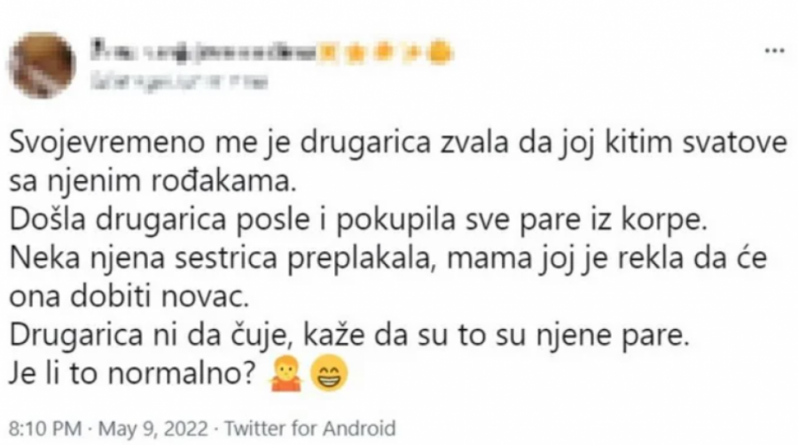 - Svojevremeno me je drugarica zvala da joj kitim svatove sa njenim rođakama. Došla drugarica posle i pokupila sve pare iz korpe. Neka njena sestrica preplakala, mama joj je rekla da će ona dobiti novac. Drugarica ni da čuje, kaže da su to njene pare. Je li to normalno? - upitala je ona na Tviteru, a komentari su se samo nizali.