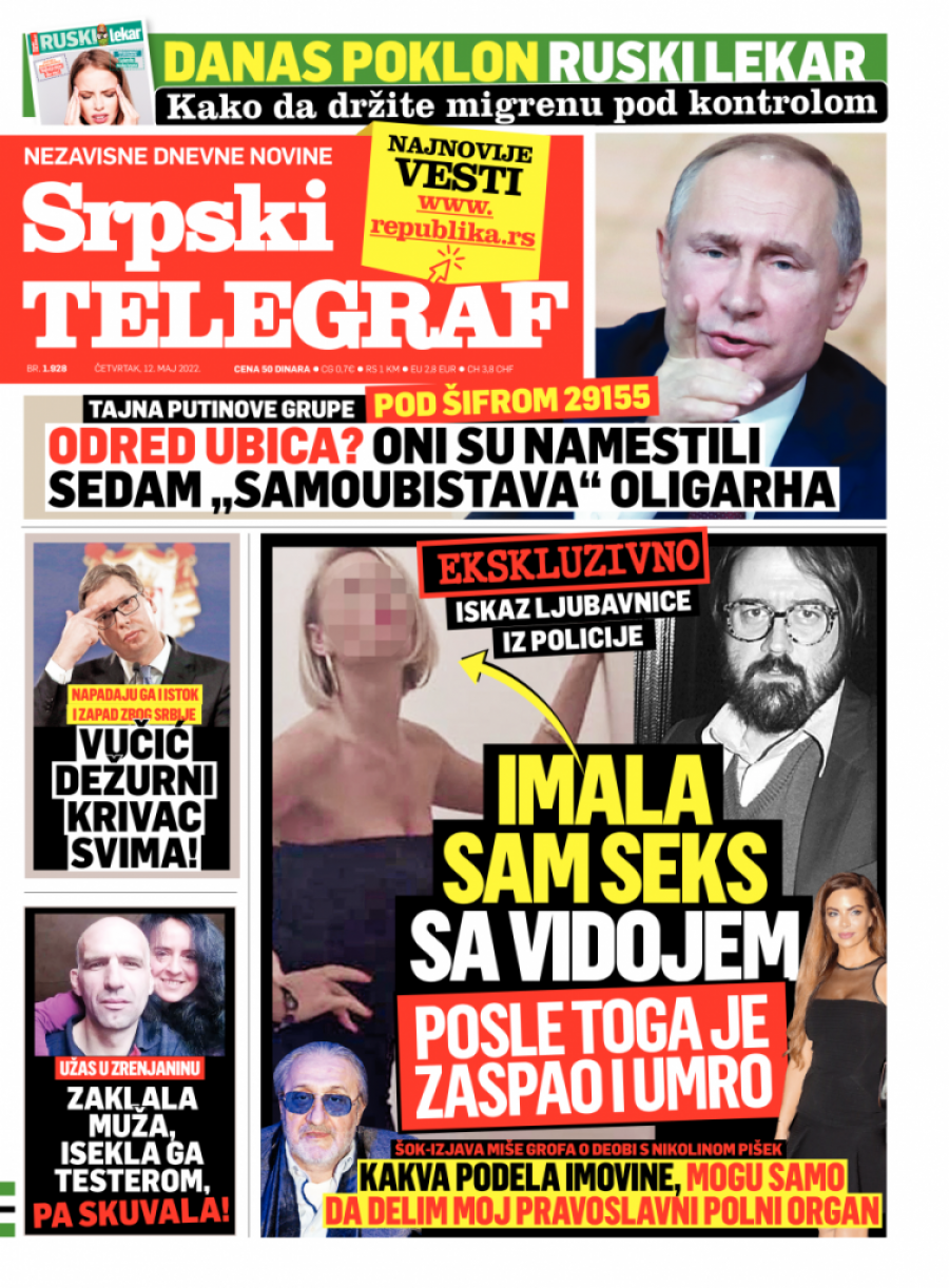 Srpski telegraf u štampanom izdanju za četvrtak 12. maj donosi pregršt važnih i interesantnih priča.