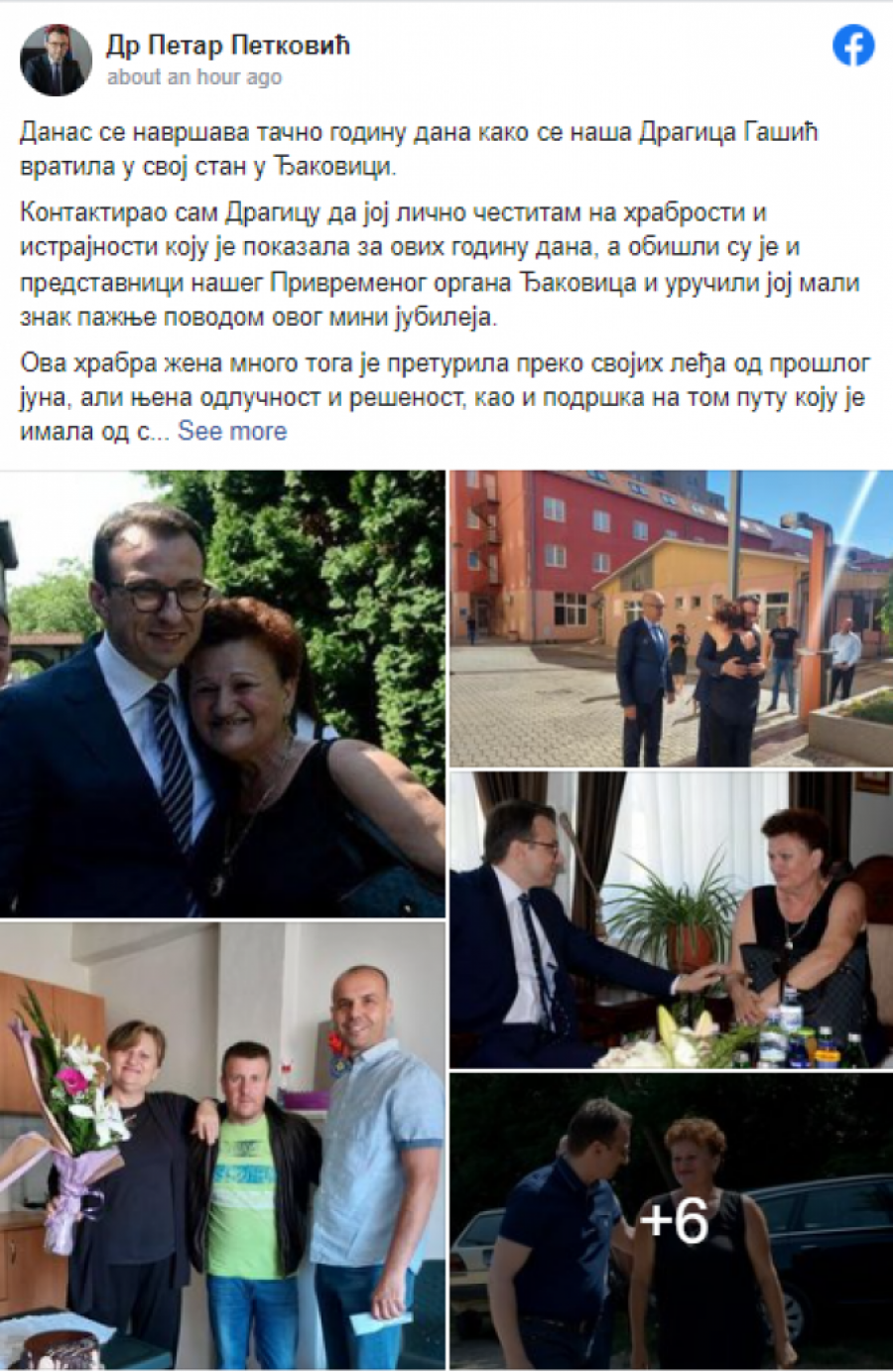 - Lično sam čestitao Dragici na hrabrosti i istrajnosti koju je pokazala za ovih godinu dana, a obišli su je i predstavnici našeg Privremenog organa Đakovica i uručili joj mali znak pažnje povodom ovog mini jubileja - napisao je on na svom fejsbuk profilu i dodao:
