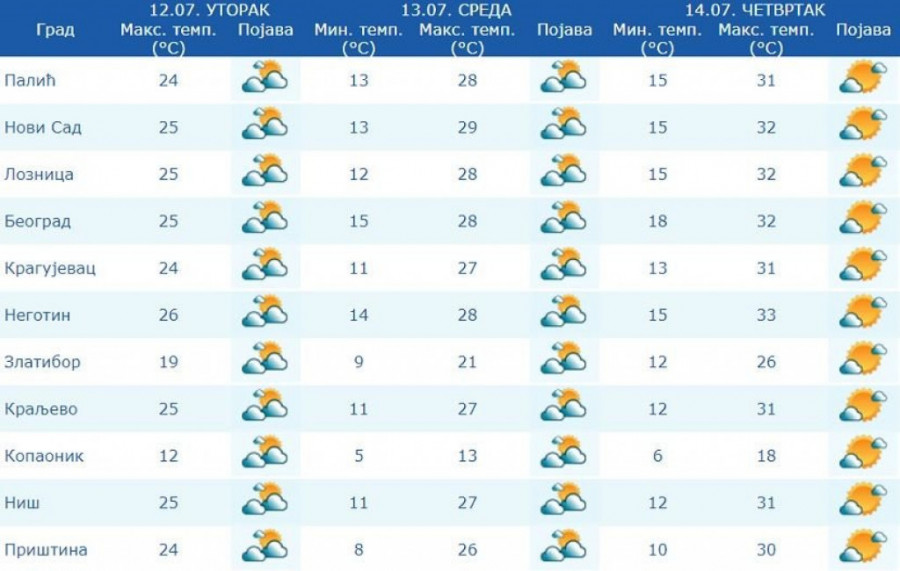 Najtopliji dani biće četvrtak i petak sa maksimalnom temperaturom od 30 do 35 stepeni.