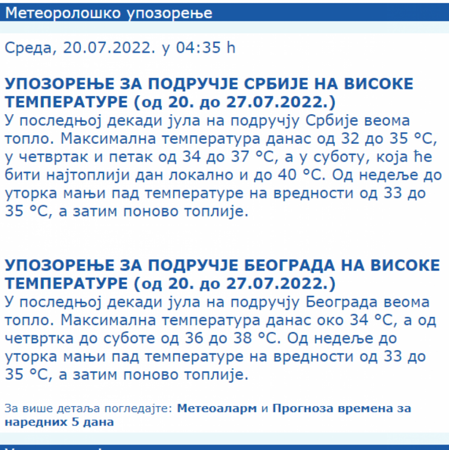 - U poslednjoj dekadi jula na području Srbije veoma toplo. Maksimalna temperatura danas od 32 do 35 °C, u četvrtak i petak od 34 do 37 °C, a u subotu, koja će biti najtopliji dan lokalno i do 40 °C. Od nedelјe do utorka manji pad temperature na vrednosti od 33 do 35 °C, a zatim ponovo toplije - stoji u upozorenju RHMZ-a za Srbiju.