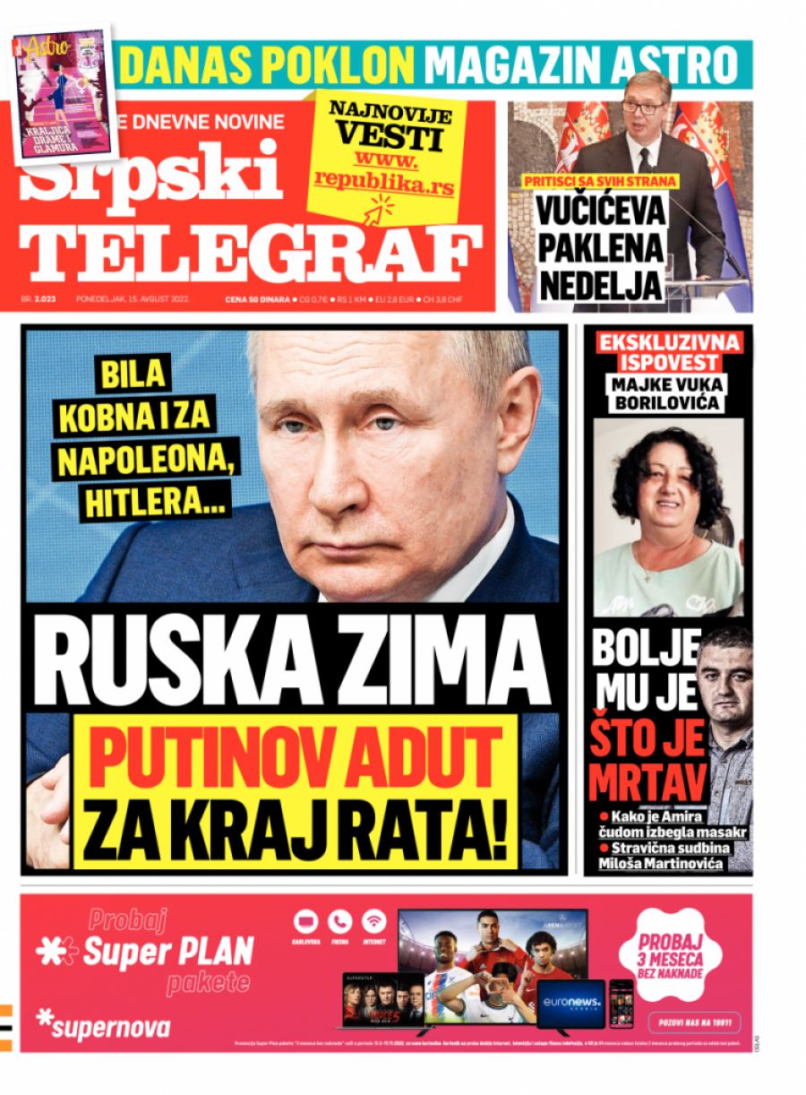 Srpski telegraf u štampanom izdanju za ponedeljak 15. avgust donosi pregršt važnih i interesantnih priča.