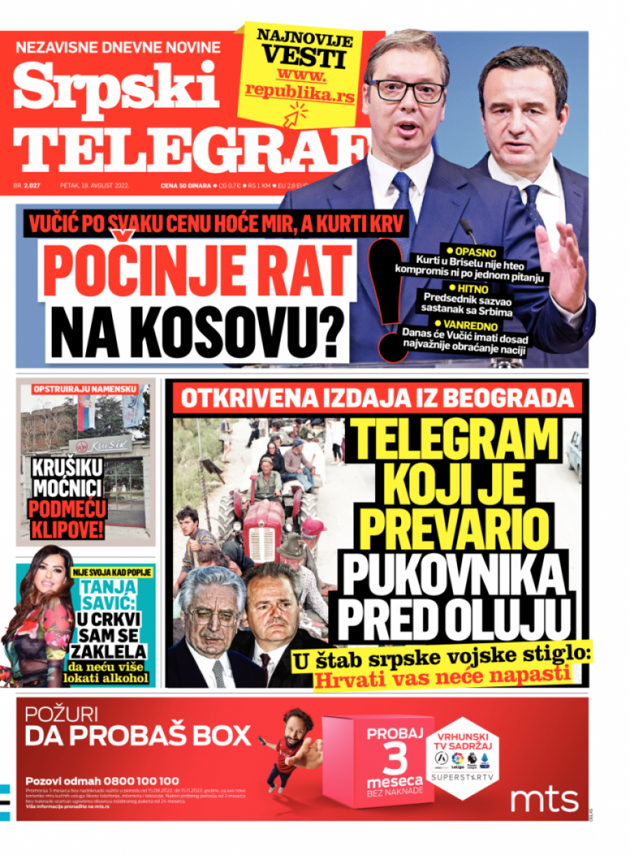 Srpski telegraf u štampanom izdanju za petak 19. avgust donosi pregršt važnih i interesantnih priča.