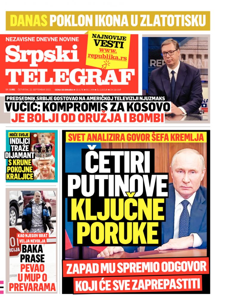 Srpski telegraf u štampanom izdanju za četvrtak 22. septembar donosi pregršt važnih i interesantnih priča.