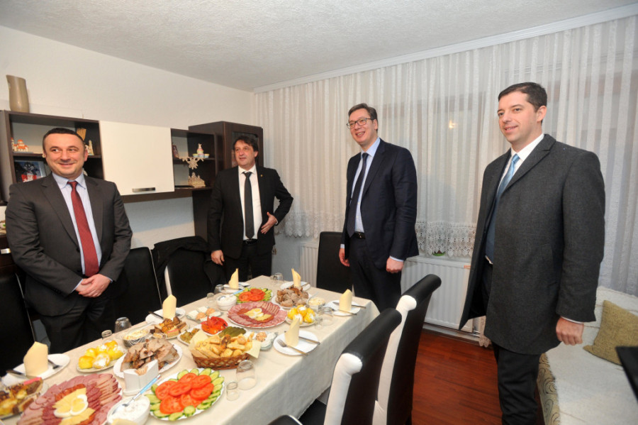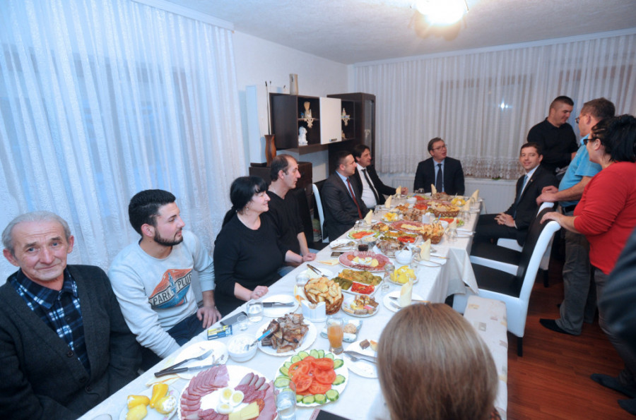 Foto: Tanjug/D. GOLLVučić je domaćinu čestitao slavu, deci podelio poklone, a potom, na molbu domaćina, seo u čelo slavskog stola.