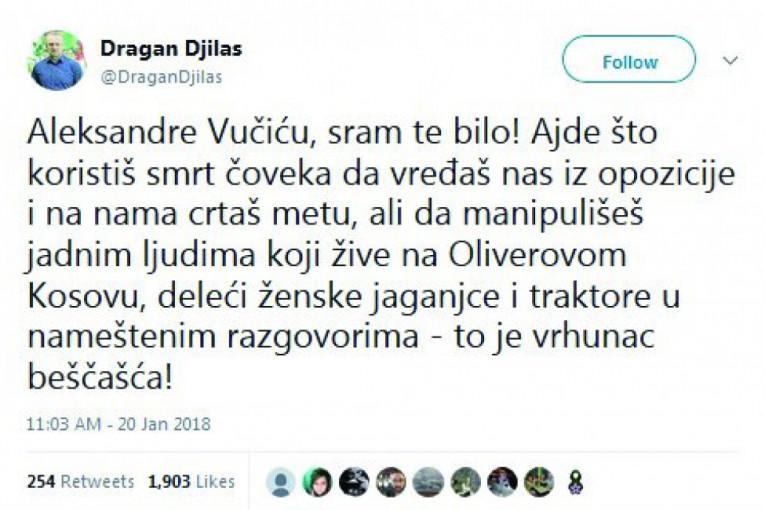 Sramnu kampanju poveo je upravo Đilas na Tviteru, što su spremno dočekali mnogi iz opozicije (pogledajte okvir i tvitove). S druge strane, nesrećni čovek koji već godinu i po dana na sve načine pokušava da spase sina i kome je Vučić, posle konsultacija sa ministrom zdravlja Zlatiborom Lončarom, obećao da će država obezbediti preko potrebnu operaciju u Bolonji ogorčeno kaže da su optužbe Đilasa i kompanije čista laž i prava sramota.