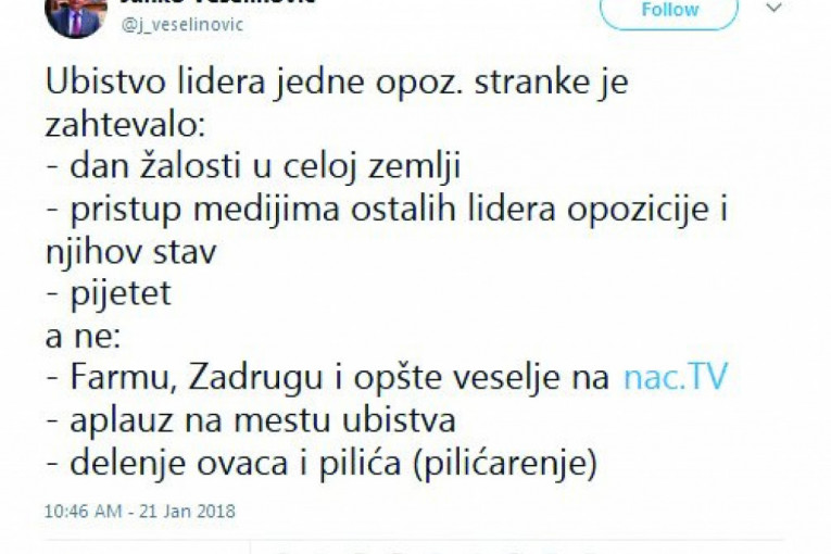 - Naravno da Dragan Đilas ne razume koliko vrede živi jaganjci, on očigledno poznaje samo one na tanjiru i vrlo mu je lagodno i komotno da iz kožne fotelje, ugodnog stana i tajkunskog života ne razume običnog čoveka na Kosovu. Umesto što se smeju i on i njegovi drugari tajkuni, mogli bi i da podele neku ovcu ili traktor i da nekome od ovih ljudi život učine makar malo lakšim - kaže Stojanović za naš list.