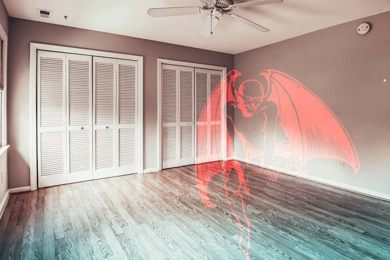 Kako se vidi na fotografiji, na drvenom podu u stanu urezan je pentagram, poznati satanistički simbol.