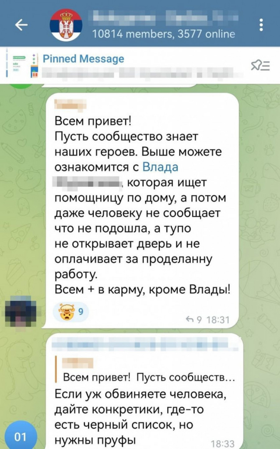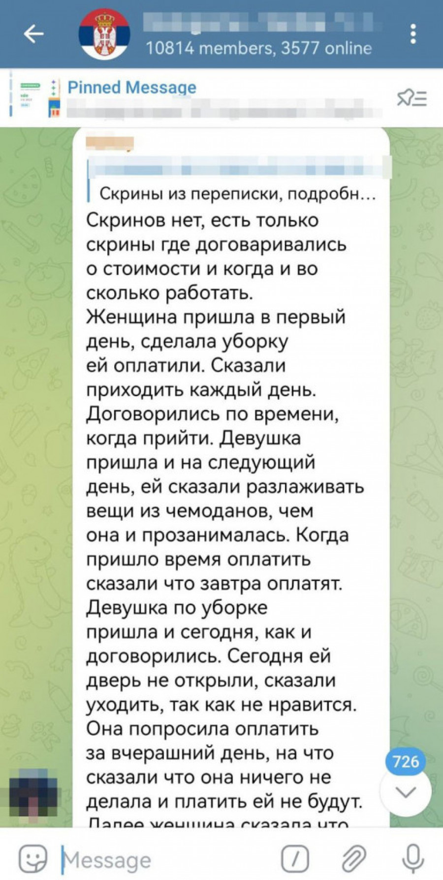 - Gospođa je tražila spremačicu i ja sam joj našla Srpkinju, sa kojom se dogovorila oko čišćenja. Kada je Srpkinja došla po novac, Ruskinja joj nije otvorila vrata i ne odgovara joj na pozive - stoji u poruci u Telegram grupi.