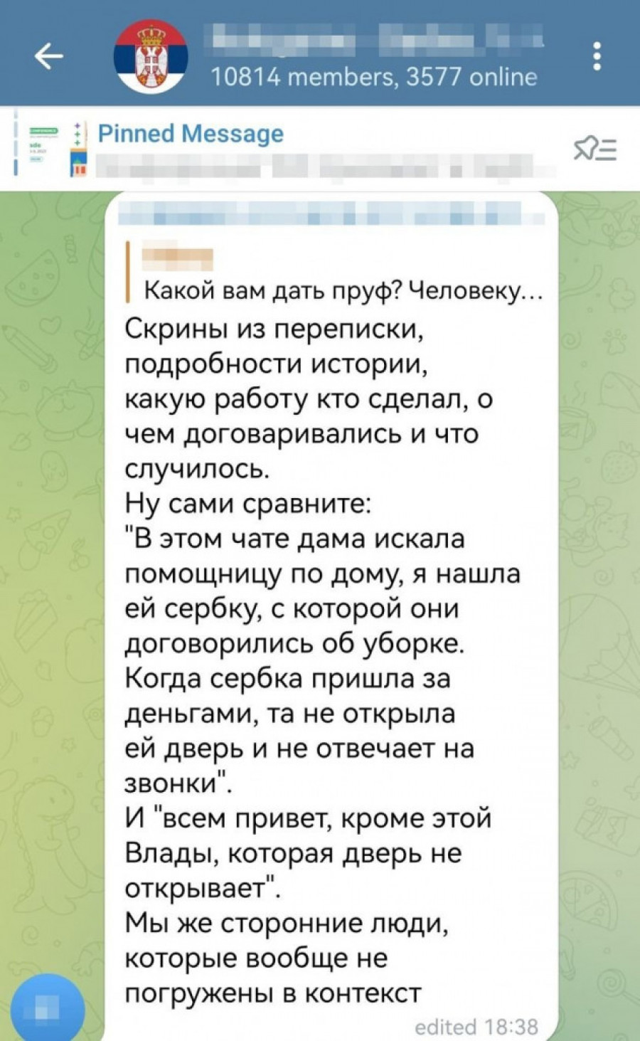 Posle molbe više članova Telegram kanala da pojasni situaciju koja im nije najjasnija, ona je rekla da je spojila Ruskinju Vladu sa svojom dugogodišnjom čistačicom - Srpkinjom, za koju kaže da je izuzetno pristojna.