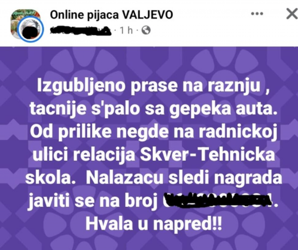 - Izgubljeno prase na raznju, tačnije spalo sa gepeka auta. Relacija Skver-Tehnička skola. Nalazaču sledi nagrada. Hvala u napred!! - napisao je ovaj čovek u grupi "Onlajn pijaca Valjevo".