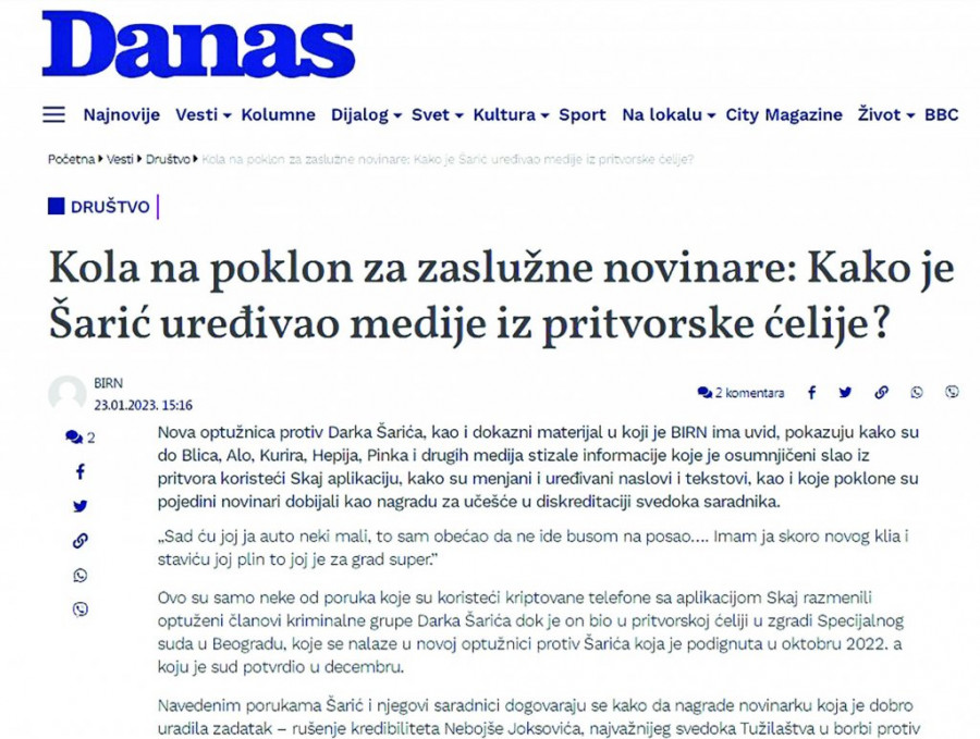 Mreža BIRN, koja se izdaje za moralnu vertikalu novinarstva, objavila je tekst "Kako je Šarić uređivao medije iz pritvorske ćelije: Kola na poklon za zaslužne novinare". U ovom tekstu BIRN se bavio temom koje je medije Šarić uređivao iz zatvorske ćelije, a materijal im je bila upravo pomenuta optužnica. Pritom su namerno sakrili da je reč i o listu Danas.