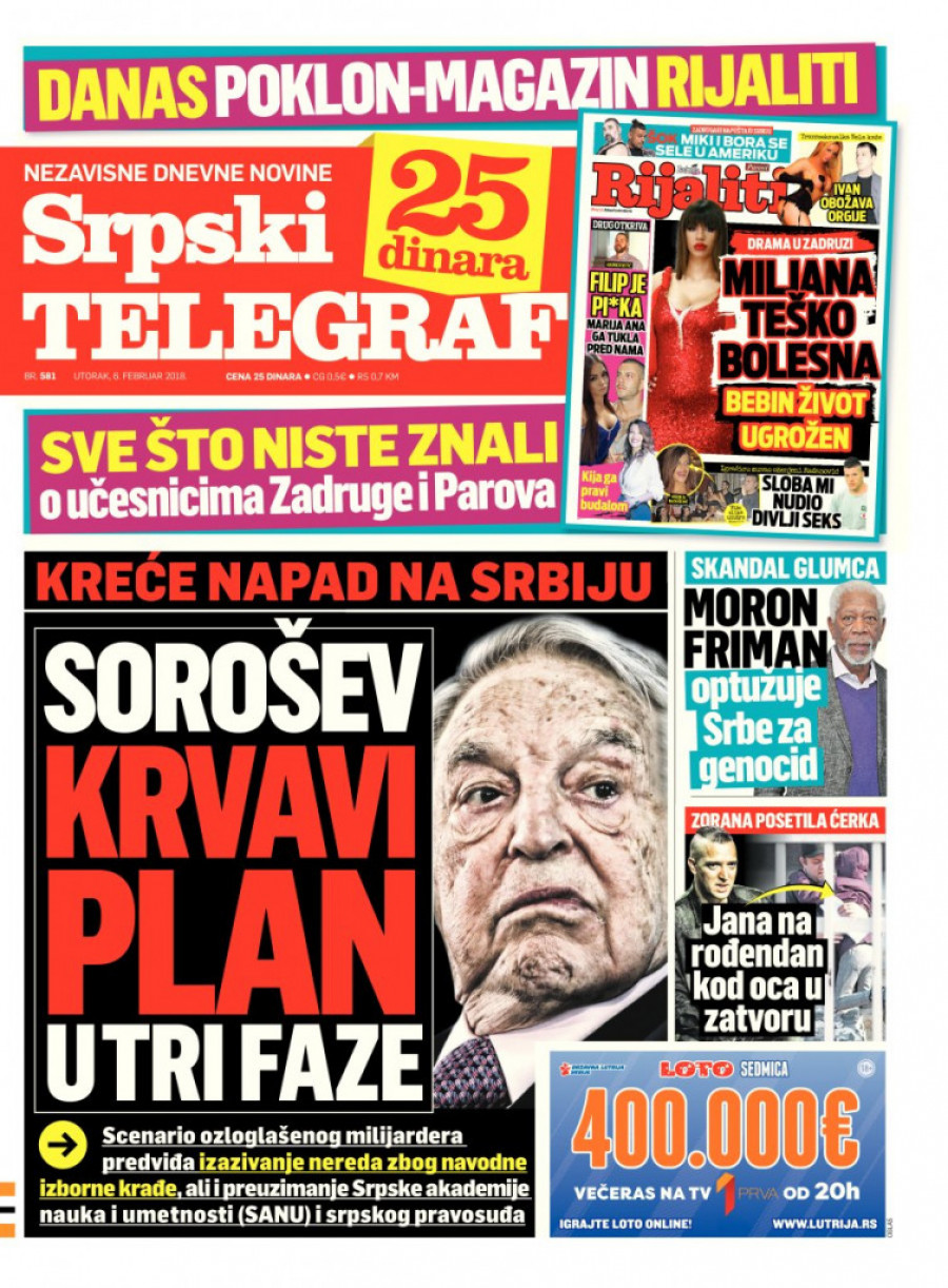 Ozloglašeni američki milijarder Džordž Soroš, poznat po rušenju mnogobrojnih režima u svetu, pokušava da zavlada Srbijom. Mračni plan podrazumeva raspirivanje i izazivanje nereda zbog navodne izborne krađe, ali i preuzimanje Srpske akademije nauka i umetnosti (SANU) i srpskog pravosuđa, otkriva Srpski telegraf. Potvrdu svojih saznanja dobili smo u obaveštajnim strukturama, ali i u SANU i pravosudnim krugovima.