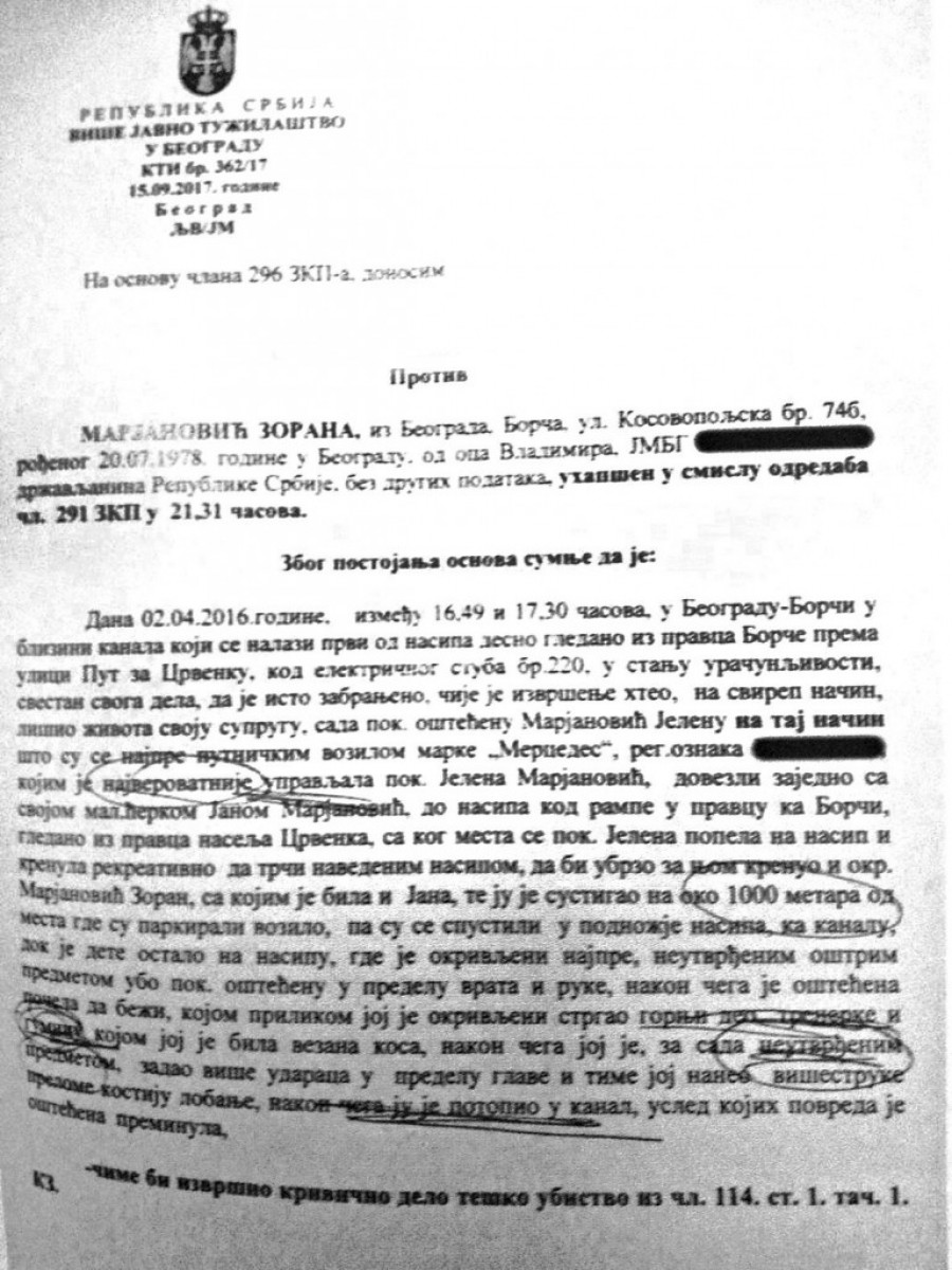 - Marjanović je sa suprugom i ćerkom bio na nasipu, a Jelena je nameravala da trči. Kad je krenula da se rekreira, ubrzo je za njom pošao i Zoran sa ćerkom. Sustigao ju je, ostavio dete samo, a onda najpre izbo suprugu po glavi i ruci, da bi je potom usmrtio udarcima po glavi, dok je ona pokušavala da se spase - navodi se u optužnici.