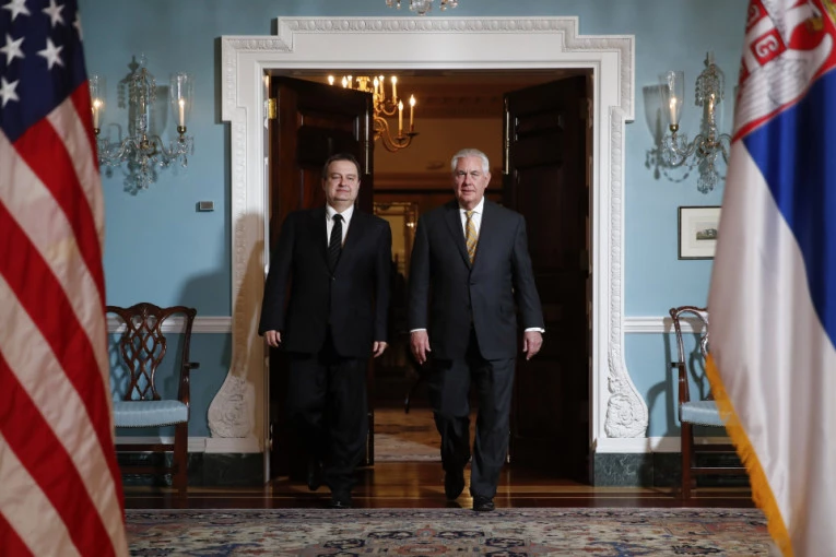 Foto: Tanjug/APTilerson je Dačića u Stejt departmentu dočekao u popodnevnim satima po lokalnom vremenu, a američki Stejt department je na svom zvaničnom Tviter nalogu objavio kratak video snimak zabeležen pred početak sastanka, u kom su prikazani Dačić i Tilerson dok zajedno ulaze u prostoriju, a potom se rukuju.