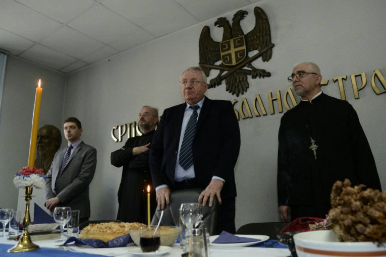 Foto: ST/N. MANDIĆGlavni domaćin bio je predsednik Srpske radikalne stranke Vojislav Šešelj. Sa svojim najbližim prijateljima i kolegama ispoštovao je tradicionalne običaje. Zapalio sveću, obrtao slavski kolač.