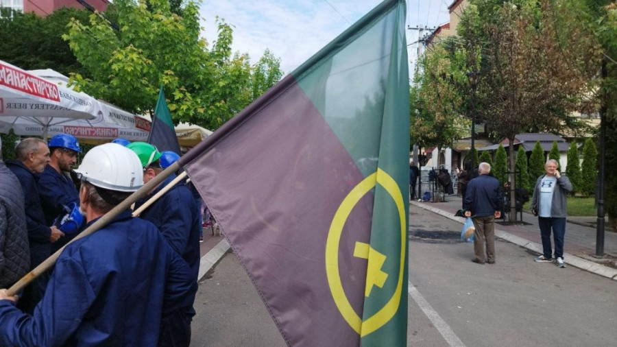 Ispred opštine Zvečan stigli su i rudari Trepče, u radnim uniformama, sa šlemovima i zastavama.