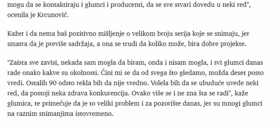 - Kaže i da nema baš pozitivno mišljenje o velikom broju serija koje se snimaju, jer smatra da je previše sadržaja, a ona se trudi da koliko može, bira dobre projekte - zabeleženo je tada kao i da je glumica rekla:
