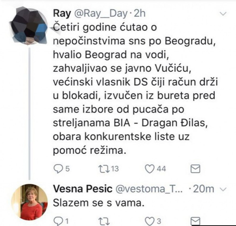Vesna Pešić, sociolog, koja podržava listu DS Dragana Šutanovca, složila se na Tviteru sa tvrdnjama jednog tviteraša da je Dragan Đilas opljačkao Demokratsku stranku, a da sada zajedno sa "pucačem" Sašom Jankovićem obara konkurentske opozicione liste uoči izbora u Beogradu.