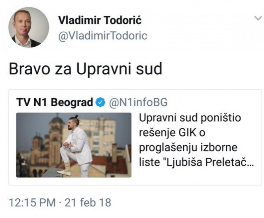 Samo da podsetimo, taj isti Upravni sud koji je oborio listu Belog je pustio da se lista DS na lokalnim izborima na Vračaru 2016. godine zove BANE KUZMANOVIĆ - VRAČAR SLOBODNO. A taj čovek se zove Branimir Kuzmanović. Bane Kuzmanović, kako se predstavljao, je izmišljeni lik kao Beli Preletačević. Ali SNS nije palo na pamet da mu to osporava, niti je iko želeo da obara listu.