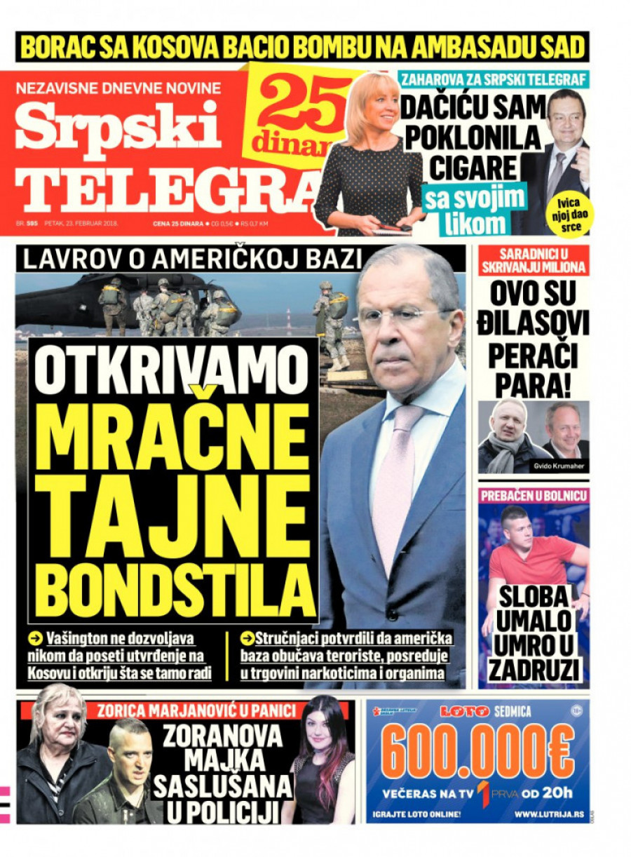 Dolaze mnogobrojna svedočanstva da je potpuno nejasno čime se bave Amerikanci u Bondstilu, poručio je ruski ministar spoljnih poslova Sergej Lavrov u Beogradu i time izrekao ono o čemu se na Kosovu govori upola glasa i zbog čega se, kažu upućeni, tamo čak i gubi glava.