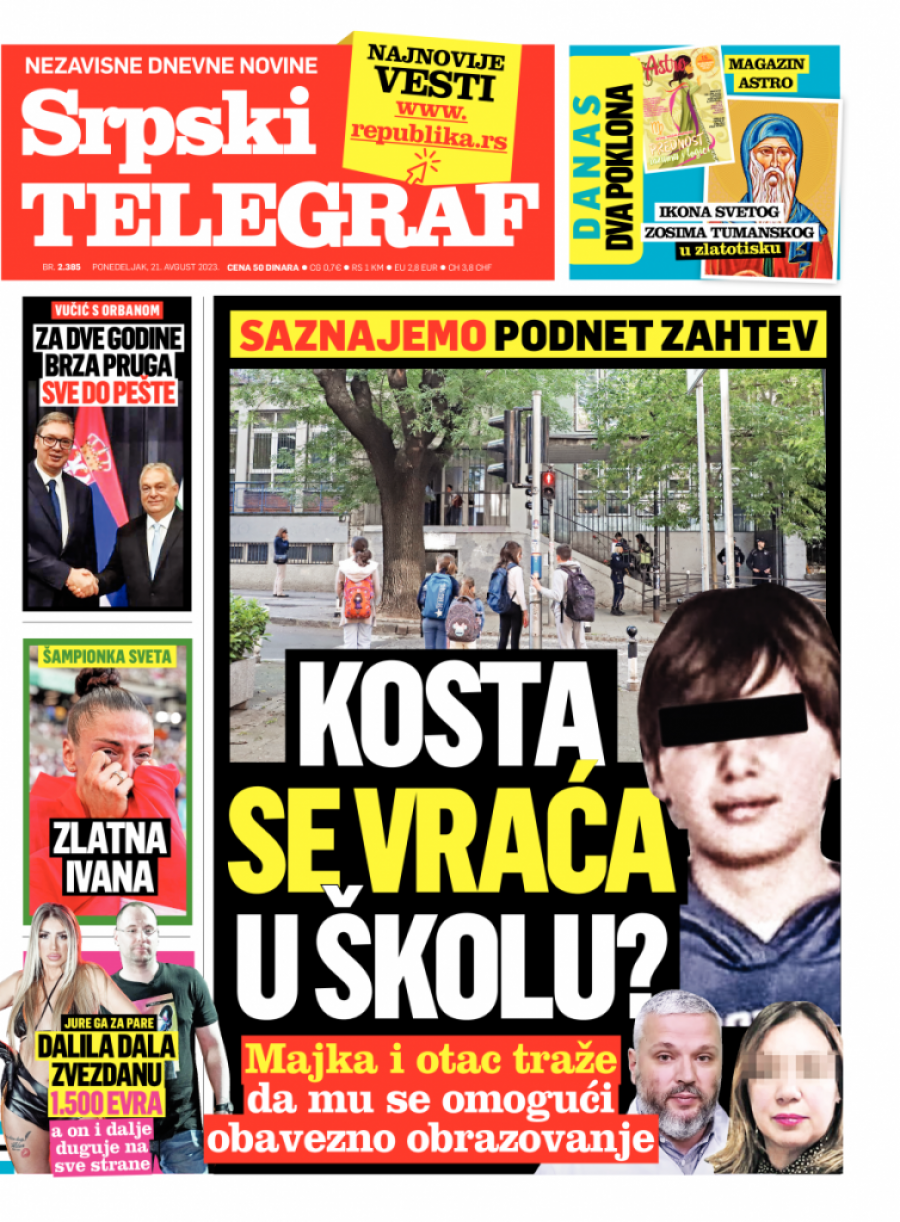 Srpski telegraf u štampanom izdanju za ponedeljak 21. avgust donosi pregršt važnih i interesantnih priča.