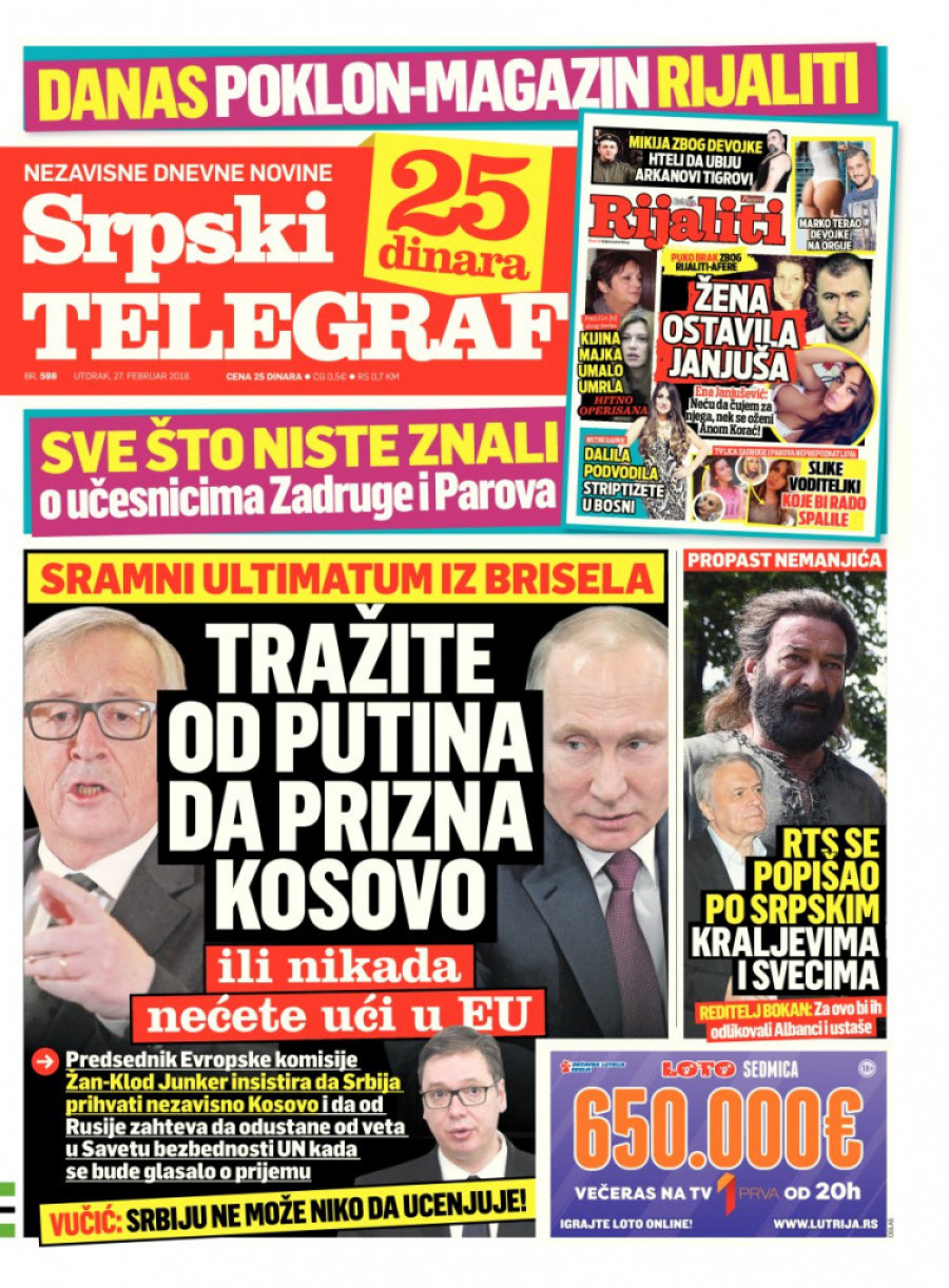 Predsednik Evropske komisije Žan-Klod Junker doneo je u Srbiju ultimatum kojim EU, pod pretnjom zaustavljanja integracija, traži od Srbije da pod hitno prizna Kosovo. Pride, Brisel zahteva i da Beograd u tajnosti zatraži od Rusije da odustane od veta u Savetu bezbednosti Ujedinjenih nacija kada dođe do glasanja o prijemu Kosova.