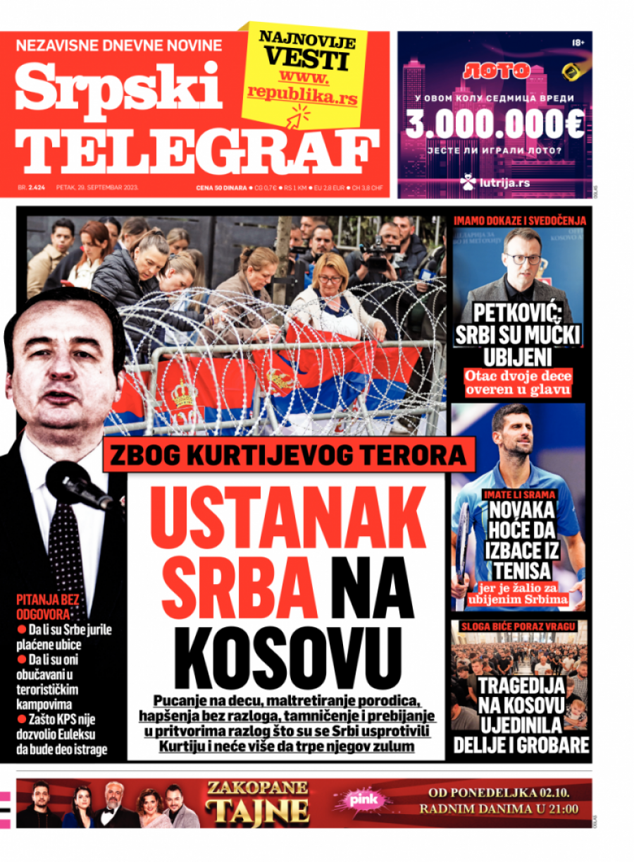 Srpski telegraf u štampanom izdanju za petak 29. septembar donosi pregršt važnih i interesantnih priča.