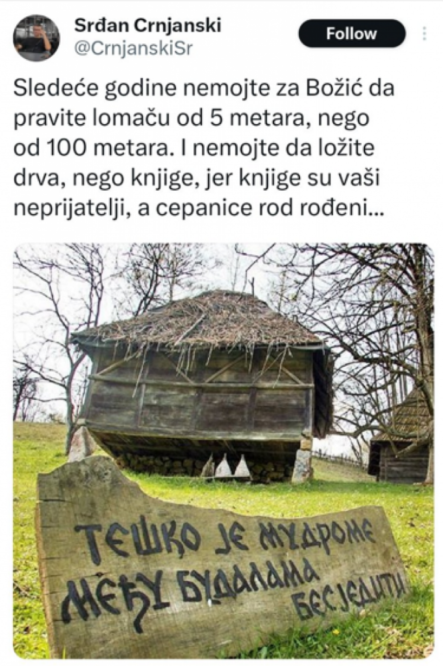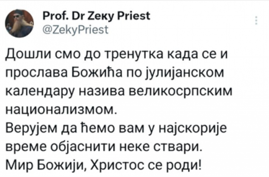 - Sad, kad dreknu pravoslavolibani, da je to naša tradicija. A lomače realno pale zadnjih pet-šest godina, tri prsta podižu otkad su prvi put videli Vuka Draškovića, spojili ih u poziciju za soljenje otkad je izmišljena Danica Crnogorčević, za Božić čuli 1989, a do 1897. mislili da je Sveti Sava dobio ime po Savi Kovačeviću. Amilj - napisao je Veljković na Tviteru.