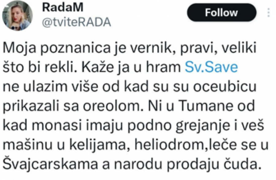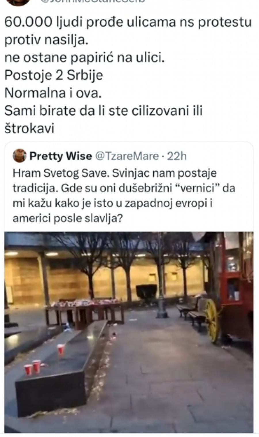 Protivnici svega srpskog obrušili su se i na ljude koji su prisustvovali božićnoj liturgiji u Hramu Svetog Save, tvrdeći da su iza sebe ostavili đubre i da je to "nenormalna Srbija", dok se drugima priviđala ideologija "krvi i tla", a samo jedan mali deo najstrašnijih uvreda možete videti u priloženim tvitovima.