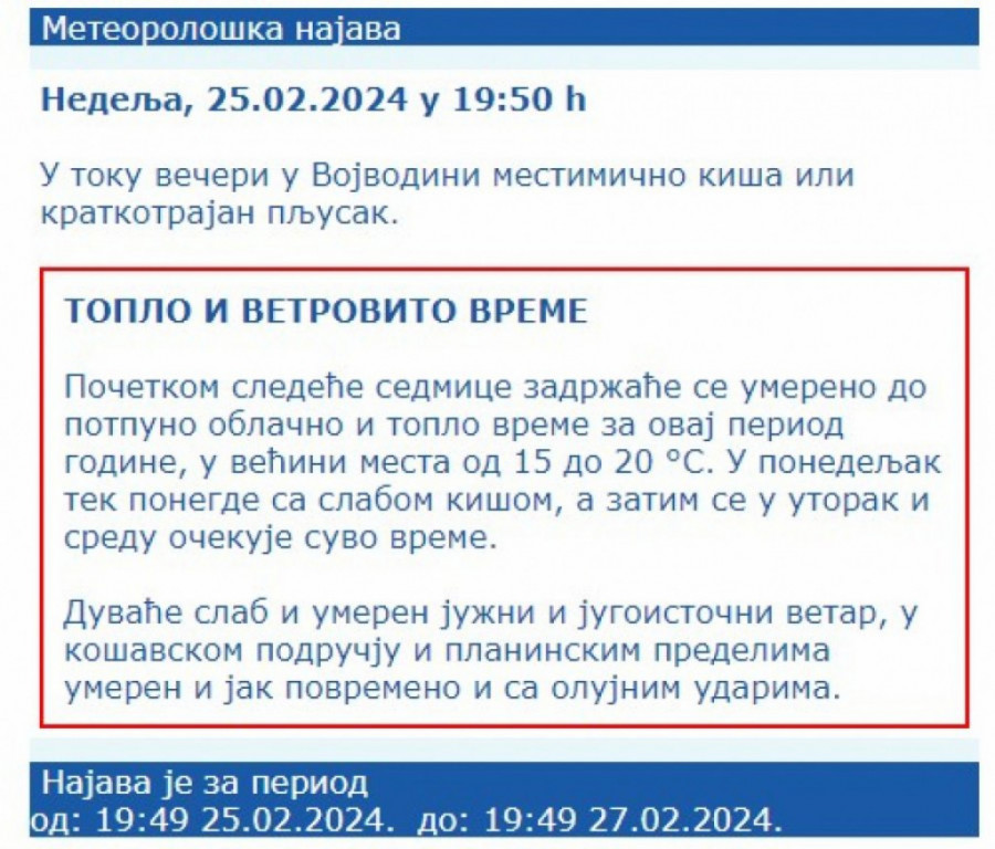 Očekuje se da će naredni period biti obeležen nestabilnim vremenskim prilikama, sa temperaturama koje su neobično visoke za ovaj period godine. Građani bi trebalo da budu svesni potencijalnih vremenskih promena i da se prilagode uslovima kako bi ostali bezbedni i zaštitili svoje imovine.