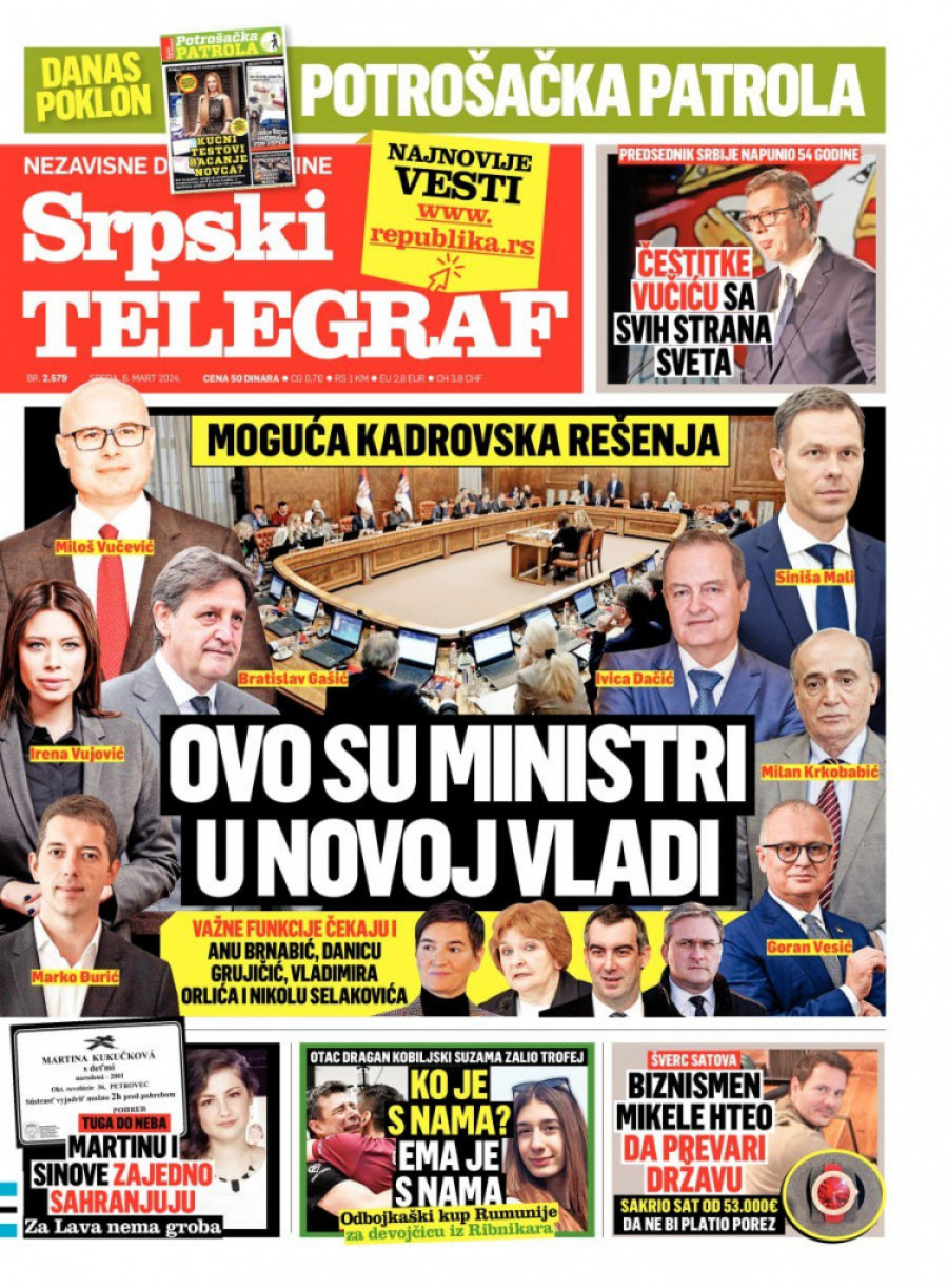 Srpski telegraf u izdanju za ponedeljak 6. mart donosi pregršt važnih i interesantnih priča.