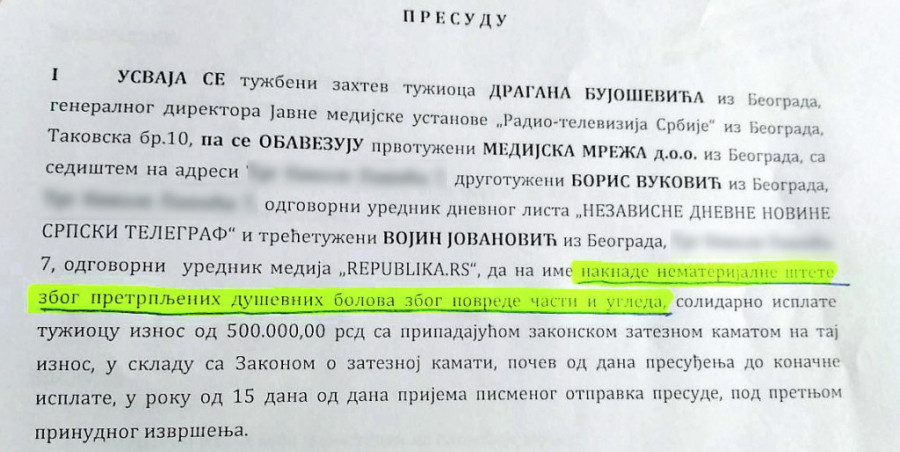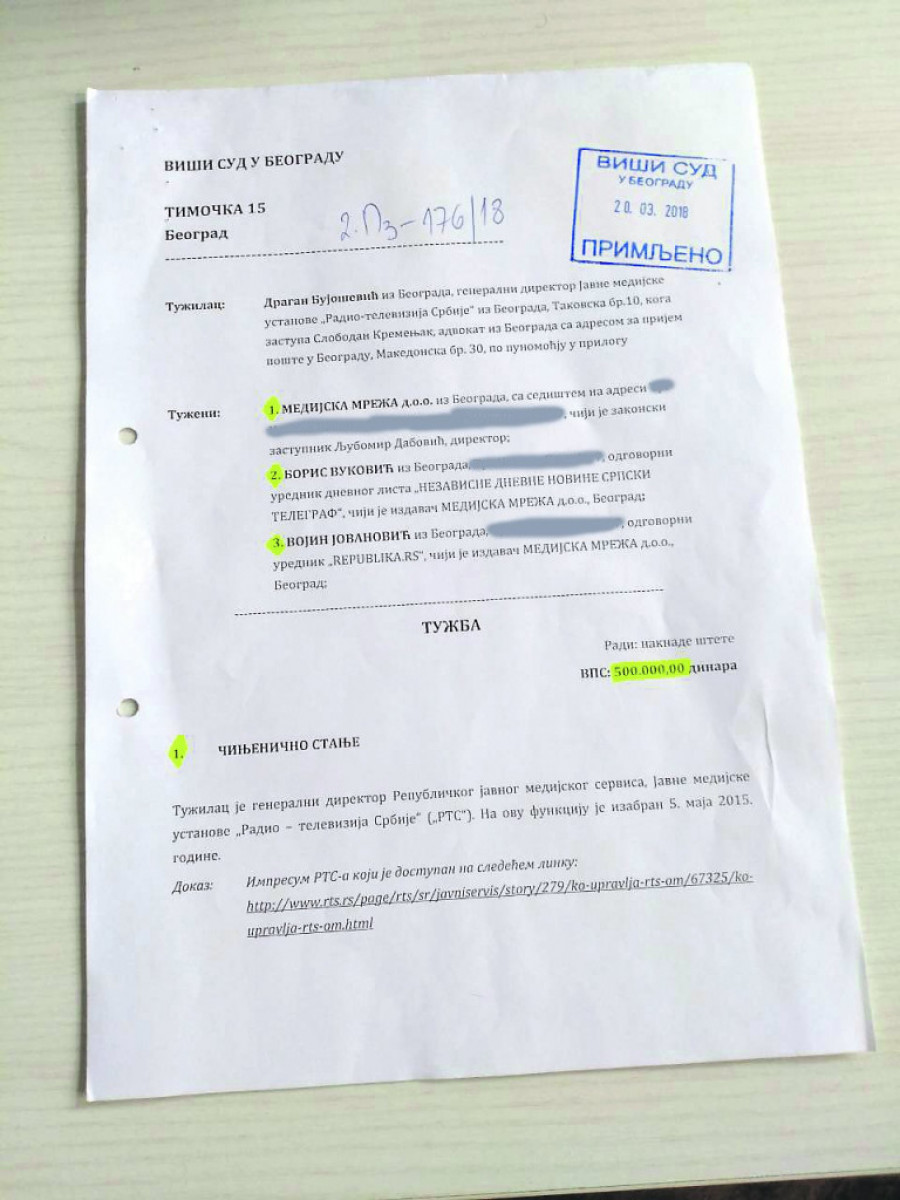 Ali pošto Bujoševiću istina o kojoj pišemo ne ide u prilog, posebno ne sume predočene javnosti, rešio je da tužbom izvrši pritisak iako dobro zna da smo u rukama imali i zvaničan zapisnik sa sednice Upravnog odbora RTS, gde su iznošene upravo primedbe o kojima smo pisali.