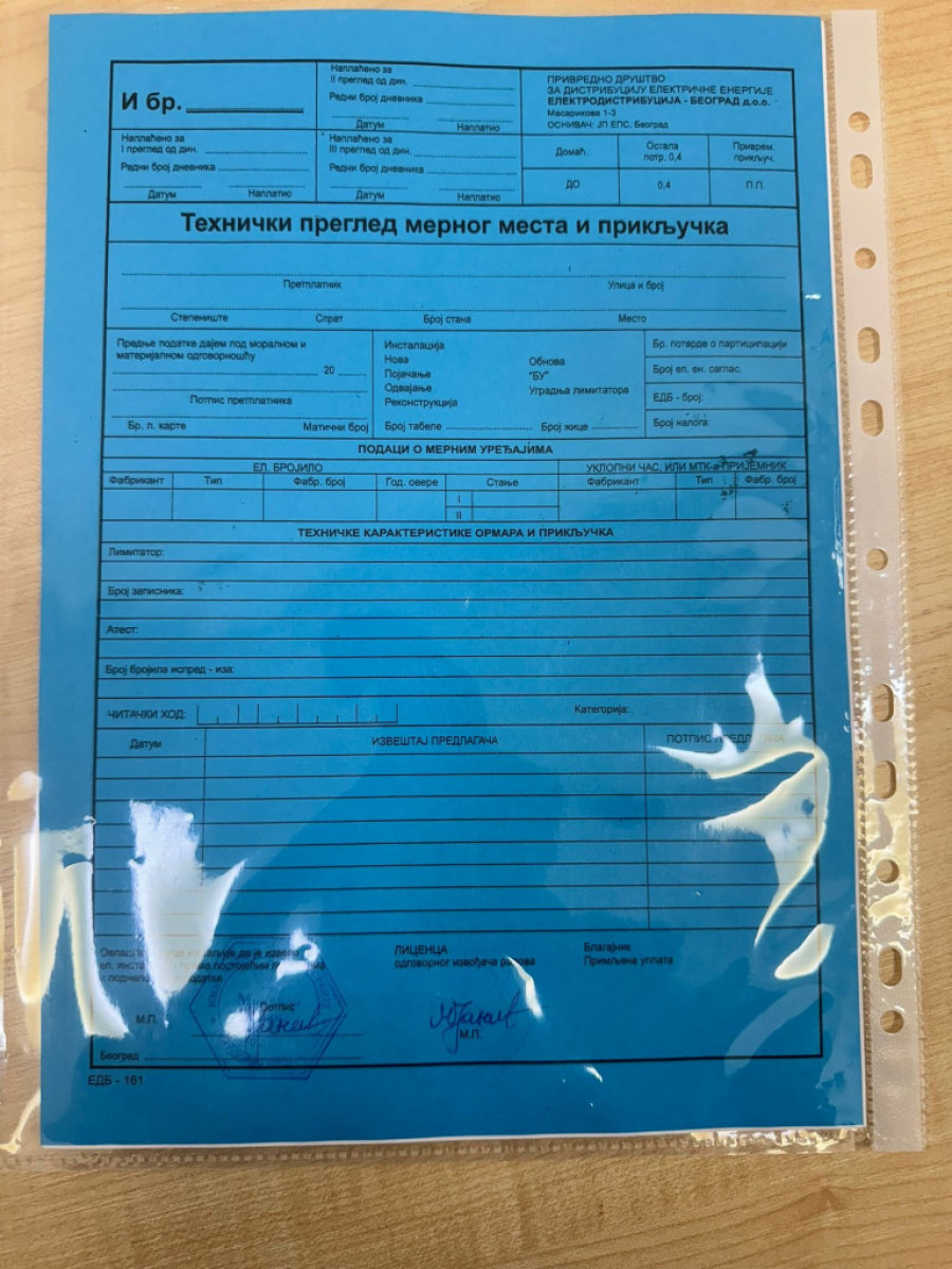 - Radi se o takozvanom plavom kartonu, koji je potreban izvođaču radova na izradi ili rekonstrukciji mernog mesta, a koji je interni dokument. U sektoru za održavanje u ogranku Obrenovac, gde sam direktor, imao sam rukovodioca koji nije posedovao licence i one su s moje strane, interno u okviru ogranka, izdavane blanko toj službi kad su bili potrebni radovi na mernim mestima usled požara i sličnih oštećenja da bi se ispoštovala naša interna procedura. Tako popunjen plavi karton se predavao službi za prijem i kontrolu mernih mesta sektora za podršku tržišta u ogranku, koja ima zadatak da merno mesto primi i evidentira u internom sistemu za evidenciju kupaca i mernih mesta. Isti se čuva u arhivi pomenute službe ogranka Obrenovac.