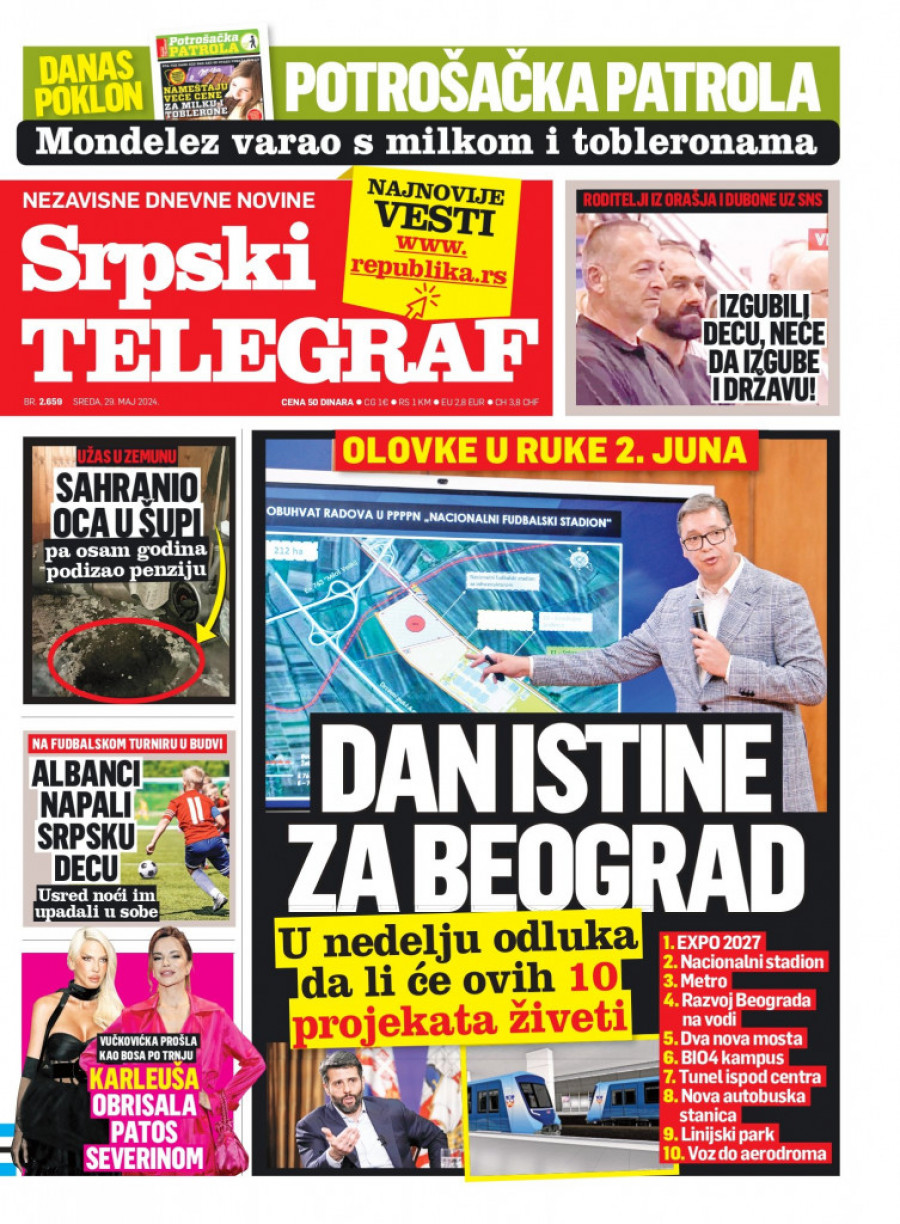 Srpski telegraf u izdanju za sredu 29. maj donosi pregršt važnih i interesantnih priča!