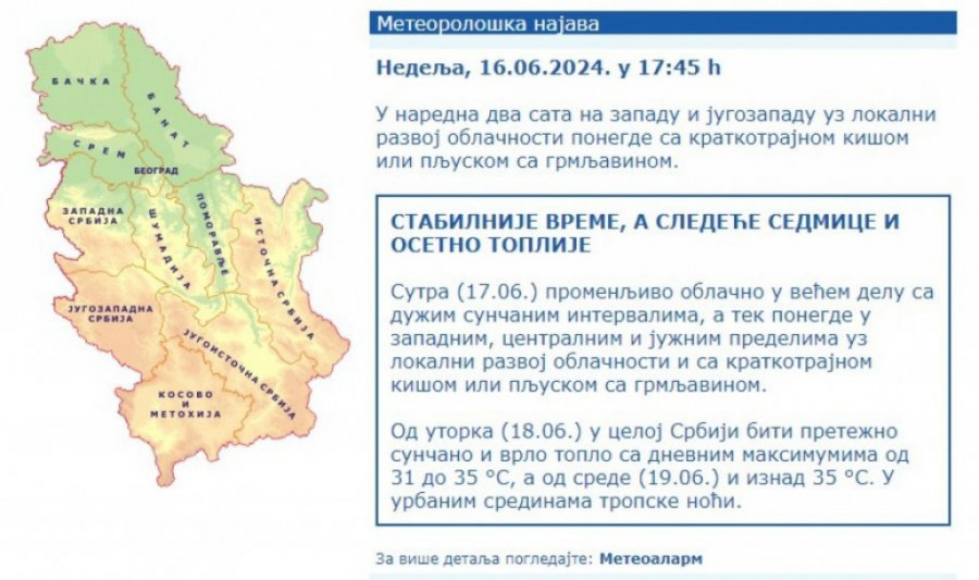 Danas je toplotni talas zahvatio neke delove Srbije, a prema najavi Republičkog hidrometeorološkog zavoda, u naredna dva sata se očekuje lokalni razvoj oblačnosti na zapadu i jugozapadu, sa mogućim kratkotrajnim kišama ili pljuskovima praćenim grmljavinom.