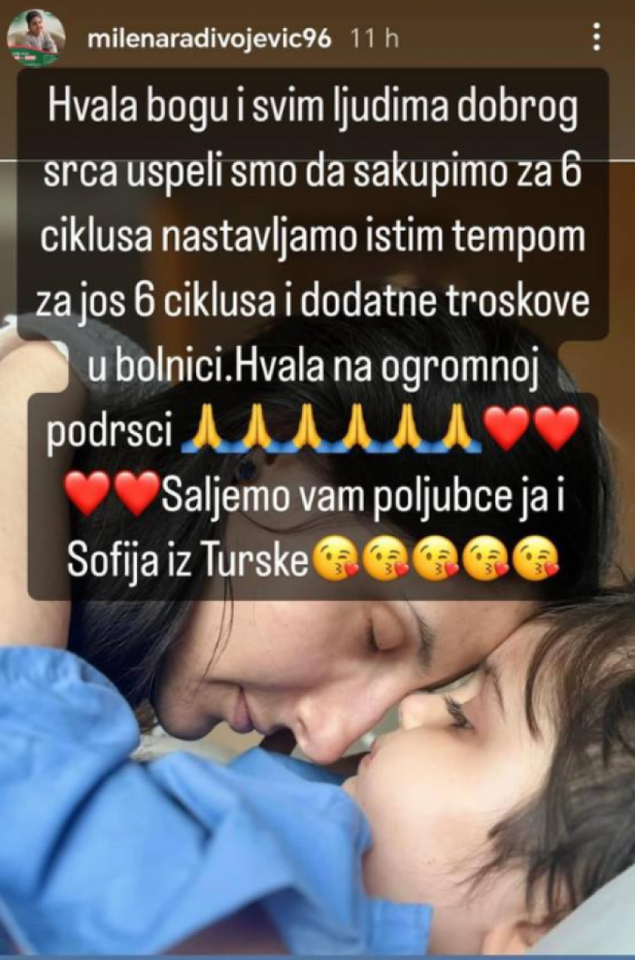 - Hvala bogu i svim ljudiba dobrog srca! Uspeli smo da sakupimo za šest ciklusa, nastavljamo istim tempom za još 6 ciklusa i dodatne troškove u bolnici. Hvala na ogromnoj podršci! Šaljemo vam poljupce ja i Sofija iz Turske!