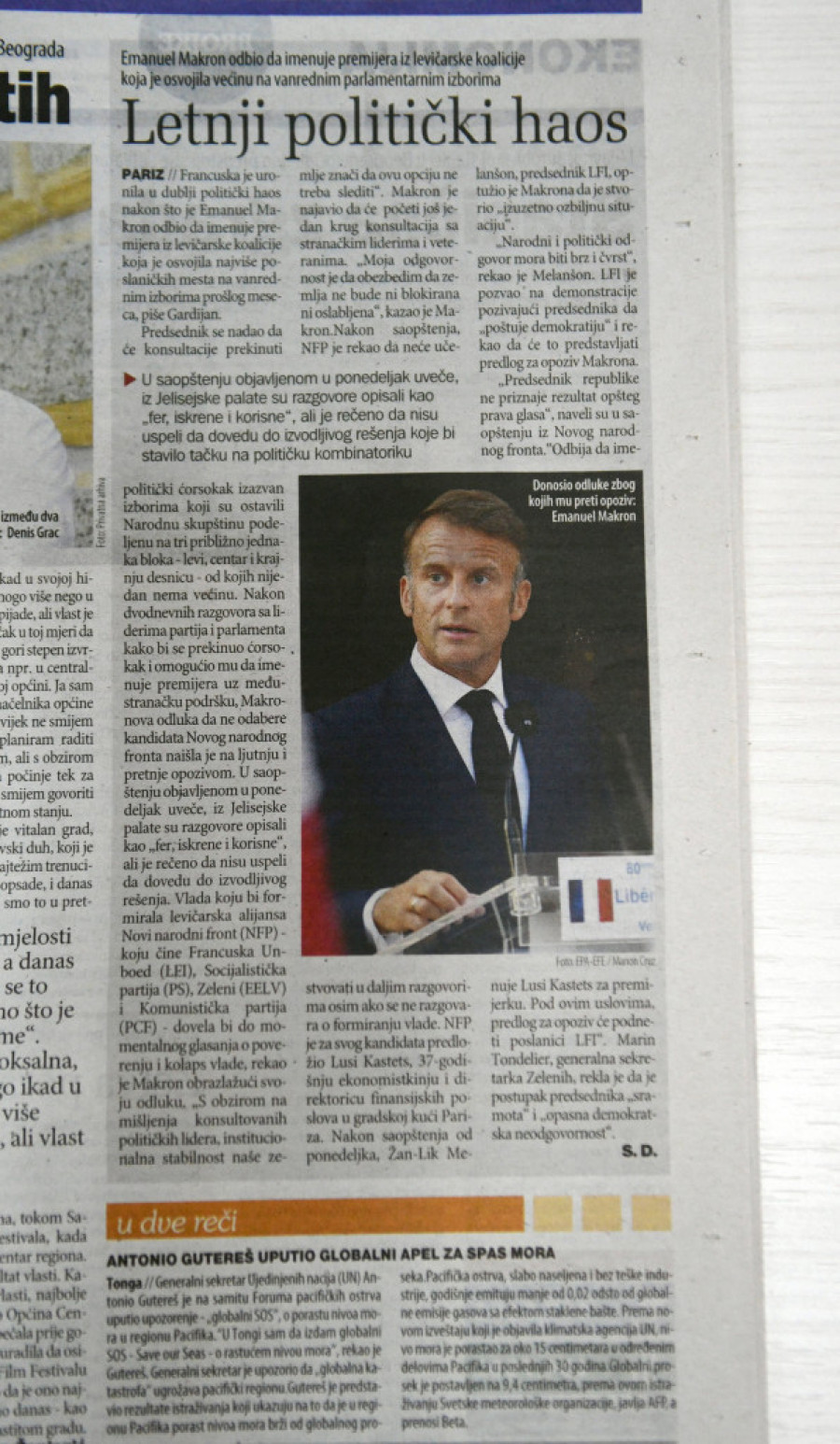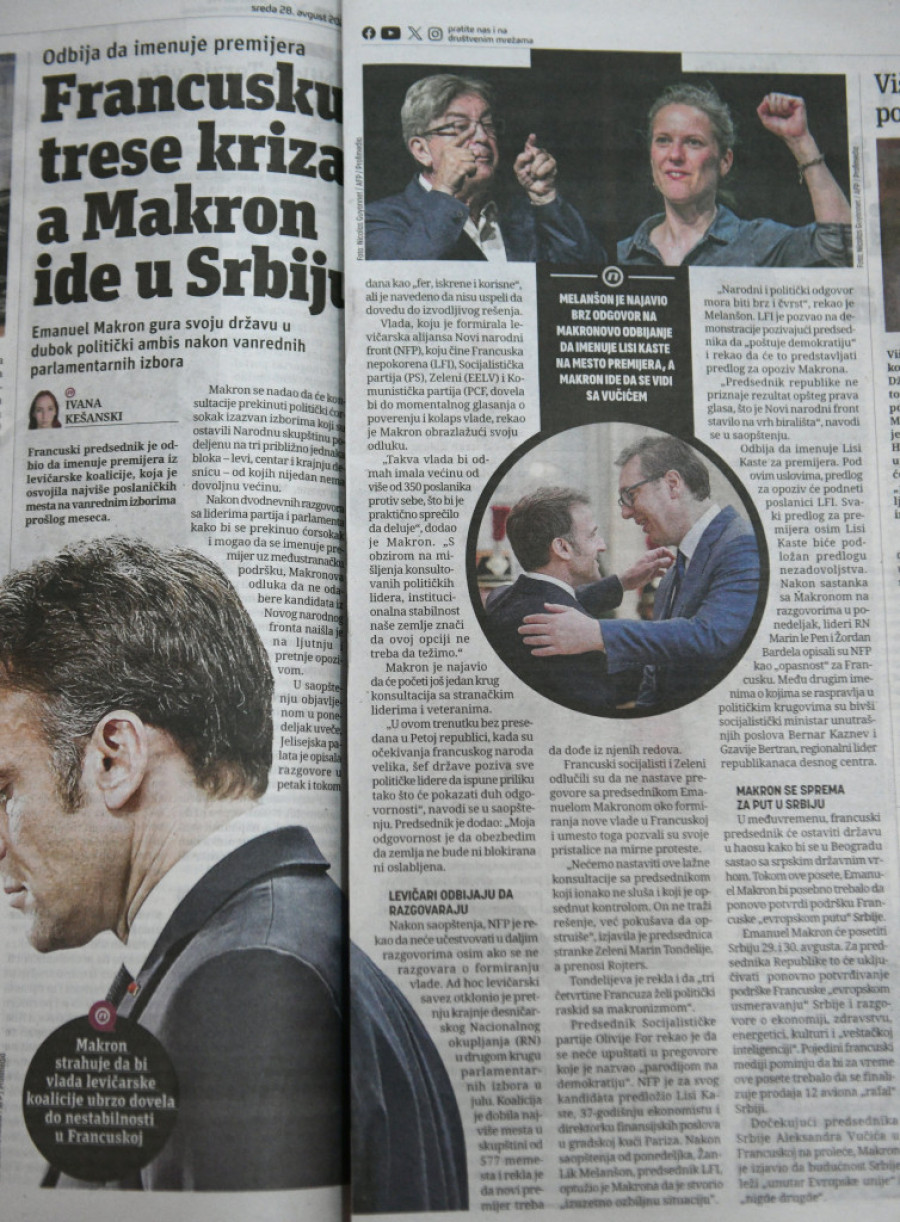 - Letnji politički haos - naslov je teksta koji su preuzeli od Gardijana, a gde pišu da je Francuska uronila u dublji politički haos nakon što je Markon odbio da imenuje premijera iz levičarske koalicije koja je osvojila najviše poslaničkih mesta na vanrednim izborima prošlog meseca.