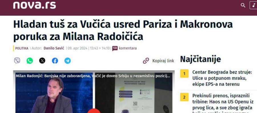 - Hladan tuš za Vučića usred Pariza i Makronova poruka za Milana Radoičića - pisala je Nova početkom aprila.