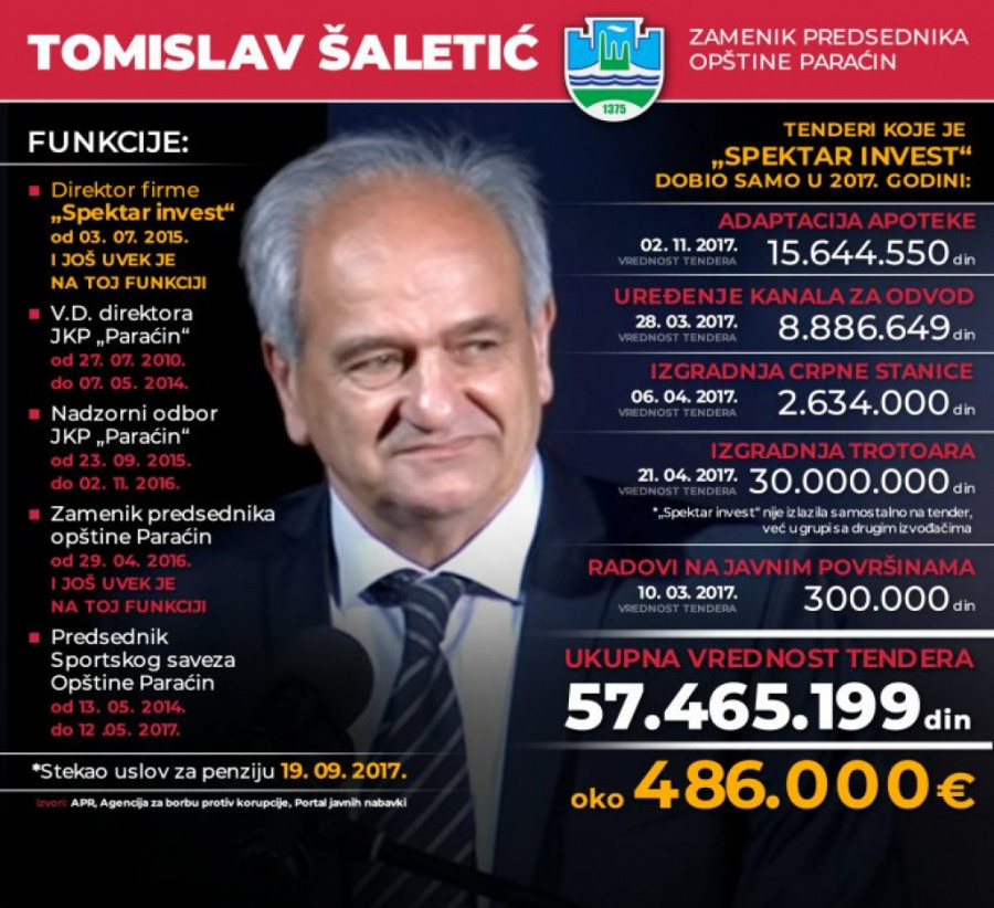 Zamenik predsednika Opštine Paraćin, Tomislav Šaletić je u isto vreme i jedan od direktora privatne firme koja je samo 2017. godine, pobedila na javnim konkursima i tenderima koje je raspisala ova Opština, u vrednosti od oko 480.000 evra. Naime, Šaletić je na funkciju zamenika predsednika Opštine Paraćin došao 29.04.2016. godine, i još uvek je na njoj, a prema podacima iz APR, Šaletić je skoro 10 meseci ranije postao jedan od direktora Akcionarskog društva za inženjering, građevinarstvo i promet, Spektar Invest. Nakon pisanja portala "Srbija danas", Šaletić je podneo zahtev da se obriše iz APR, tačnije 17.04.2018, međutim, taj zahtev je ODBIJEN i on se i dalje nalazi na funkciji direktora te privatne firme.