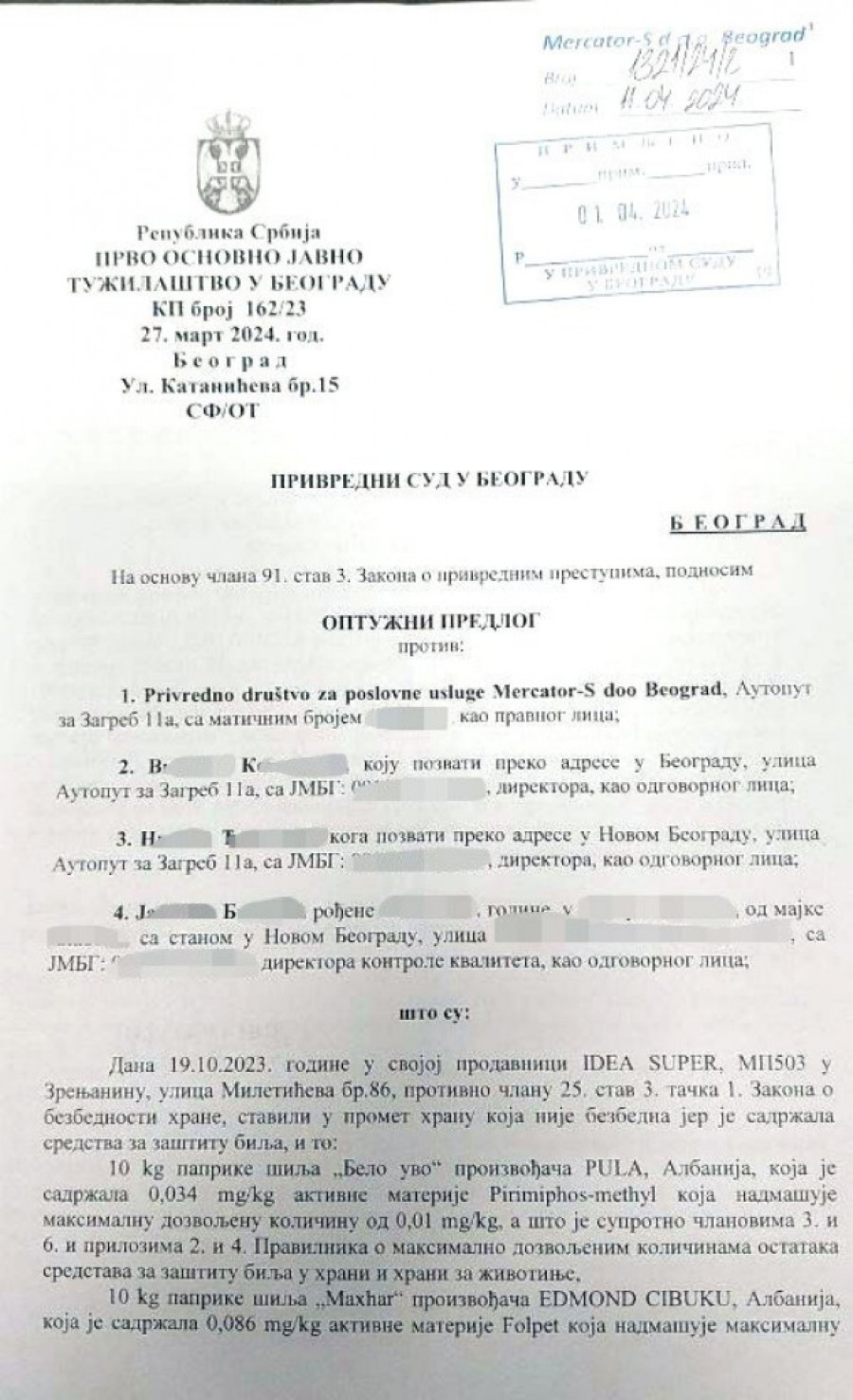 O malverzacijama u "Merkatoru S" Srpski telegraf je pisao proteklih pet dana. Najpre da je u promet pustio papriku šilja, uvezenu iz Albanije, s količinom opasnih pesticida i insekticida koja je mnogostruko (čak i 30-40 puta) veća od dozvoljene. Zbog toga je protiv same kompanije, kao i troje njenih direktora (V. K., J. B. i N. Ć.) podnet optužni predlog i čeka ih suđenje u Privrednom sudu.