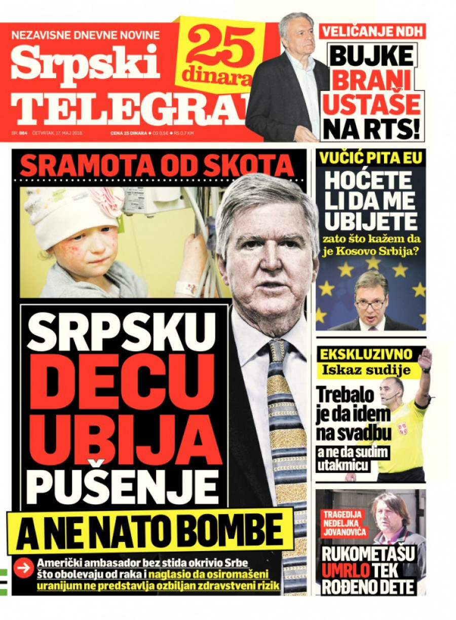 Umesto da se stidi zločina koji je NATO počinio nad Srbijom, američki ambasador Kajl Skot usudio se da okrivi Srbe da su sami krivi što sve masovnije umiru od raka i drugih teških bolesti. Skot je bez pardona izjavio da osiromašeni uranijum ne predstavlja ozbiljan zdravstveni rizik i da su za povećanje broja obolelih krivi genetika i nezdrav život koji vodimo.